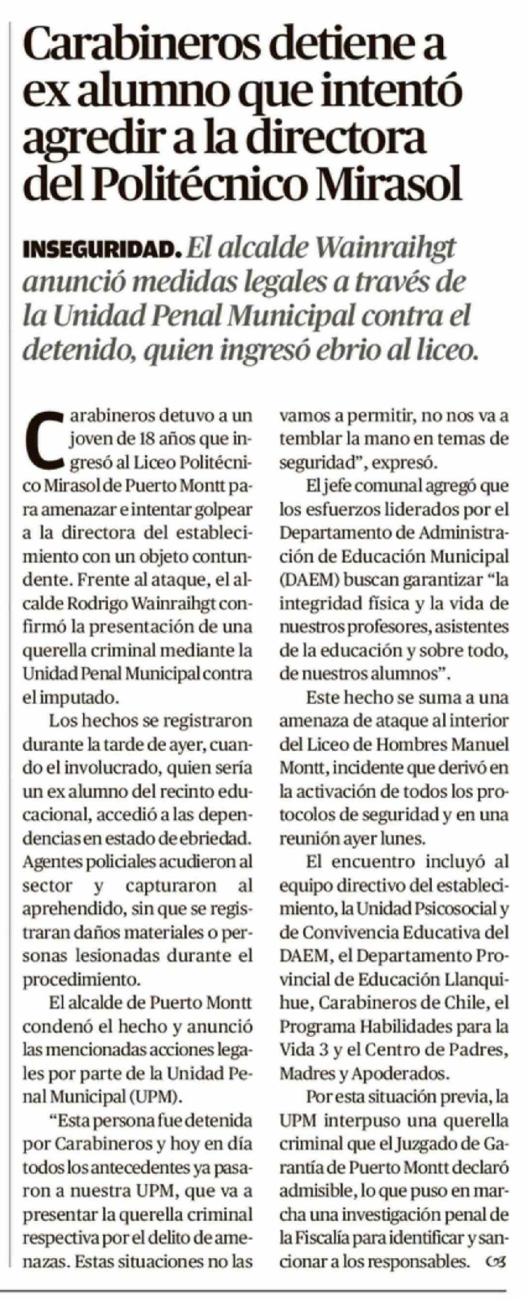 Carabineros detiene a ex alumno que intentó agredir a la directora del Politécnico Mirasol