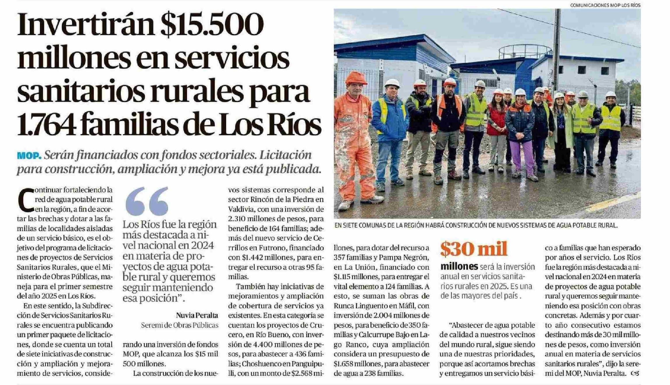 Invertirán $15.500 millones en servicios sanitarios rurales para 1:764 familias de Los Ríos