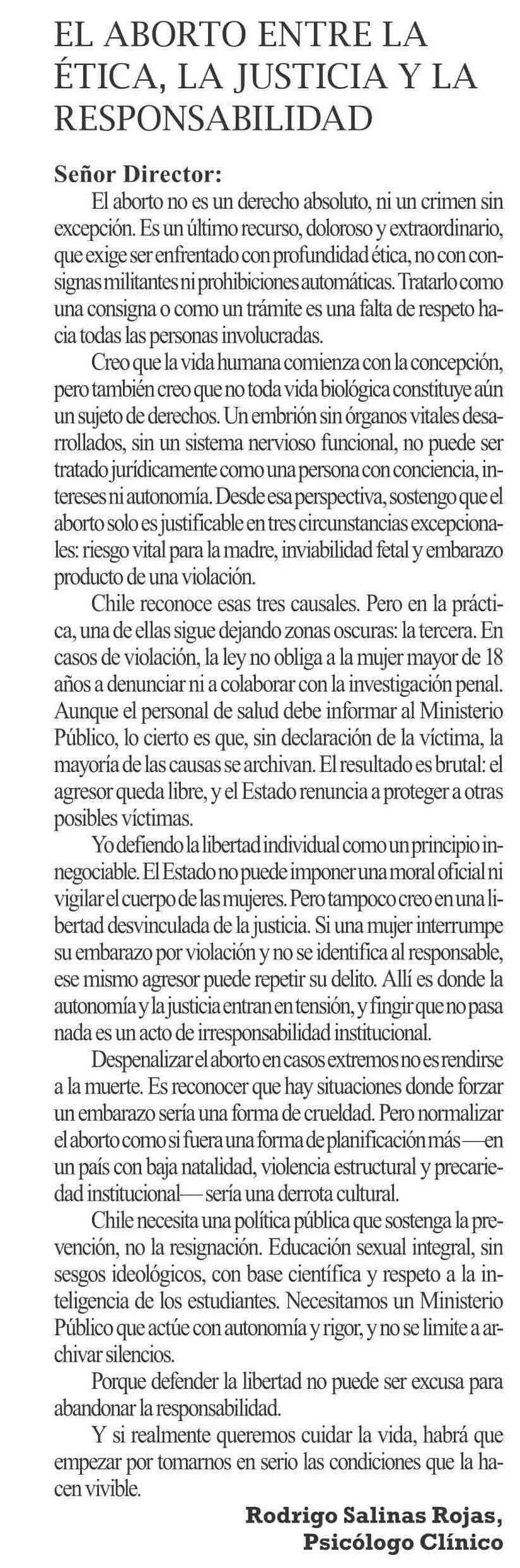 CARTAS: EL ABORTO ENTRE LA ÉTICA, LA JUSTICIA Y LA RESPONSABILIDAD