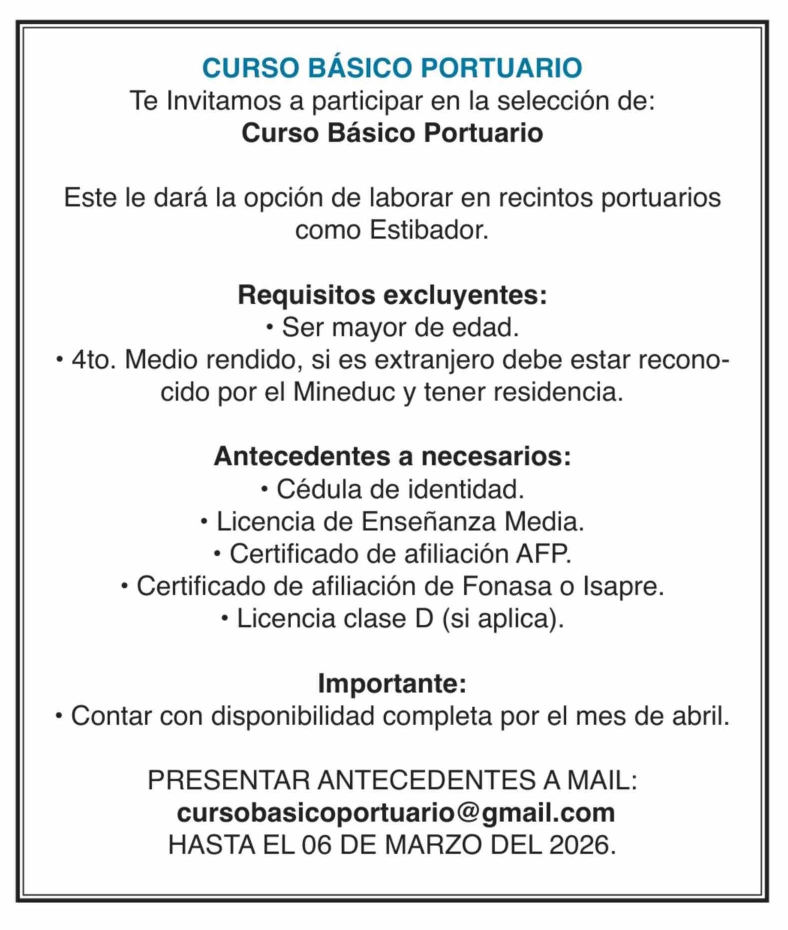 Aviso Publicitario: CURSO BÁSICO PORTUARIO Te Invitamos a participar en la selección de: Curso Básico Portuario