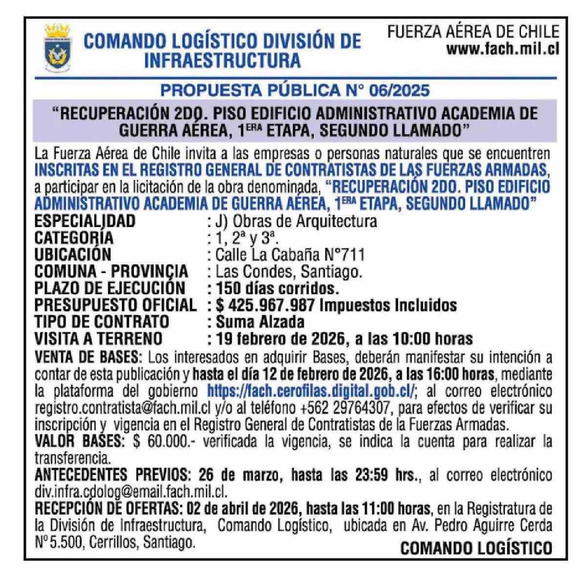 AVISO LICITACIONES: FUERZA AÉREA DE CHILE