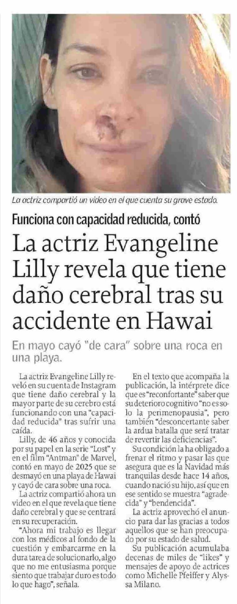 La actriz Evangeline Lilly revela que tiene daño cerebral tras su accidente en Hawai
