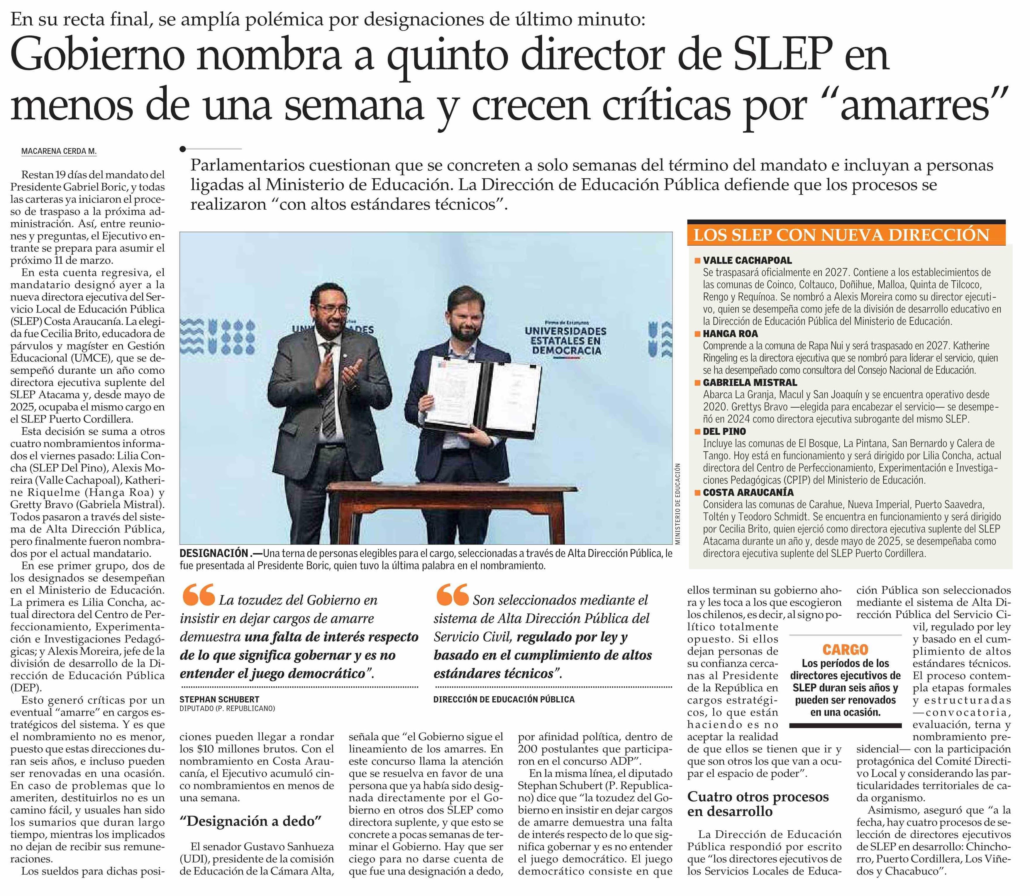 Gobierno nombra a quinto director de SLEP en menos de una semana y crecen críticas por “amarres”