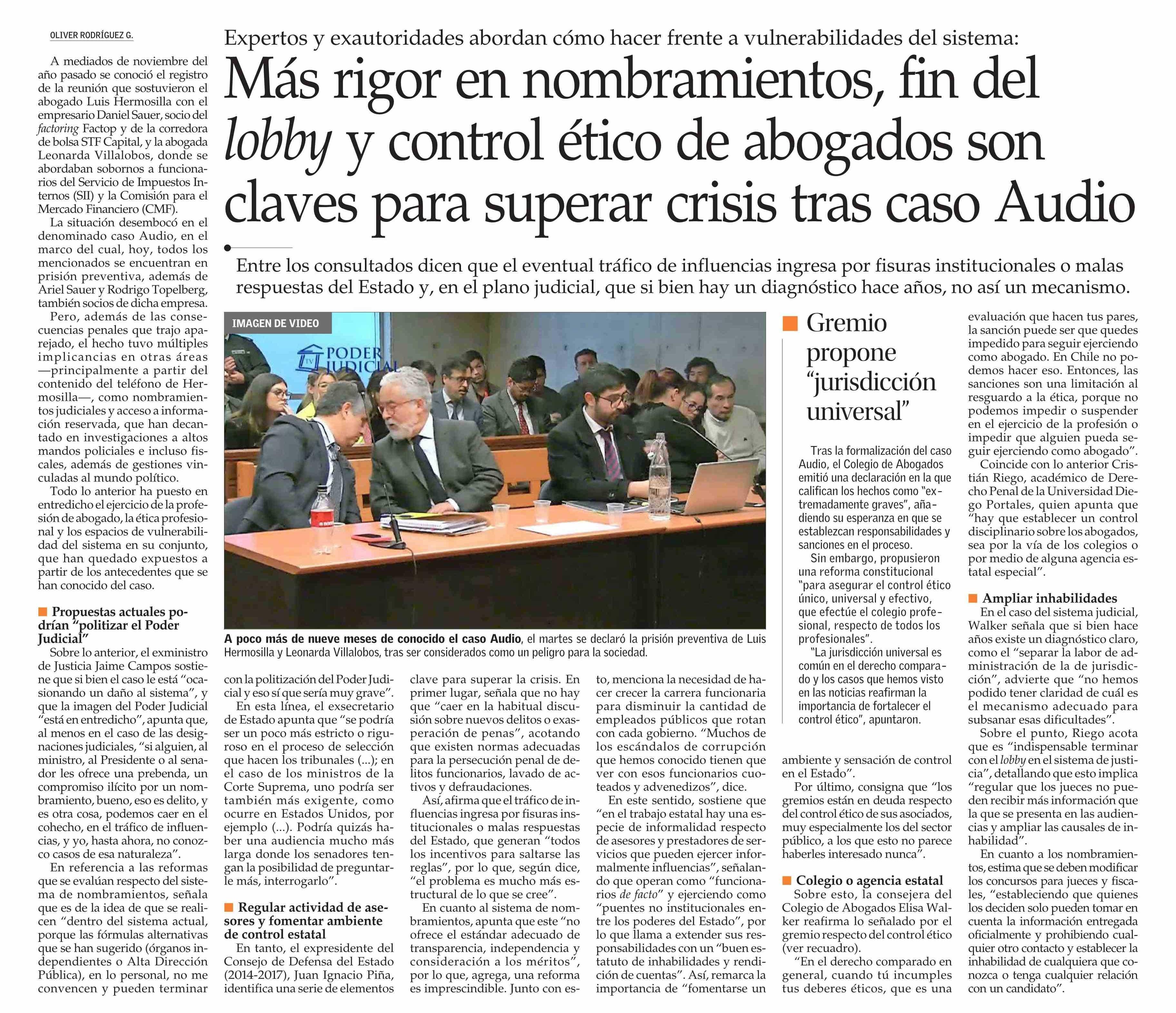 Más rigor en nombramientos, fin del lobby y control ético de abogados son claves para superar crisis tras caso Audio