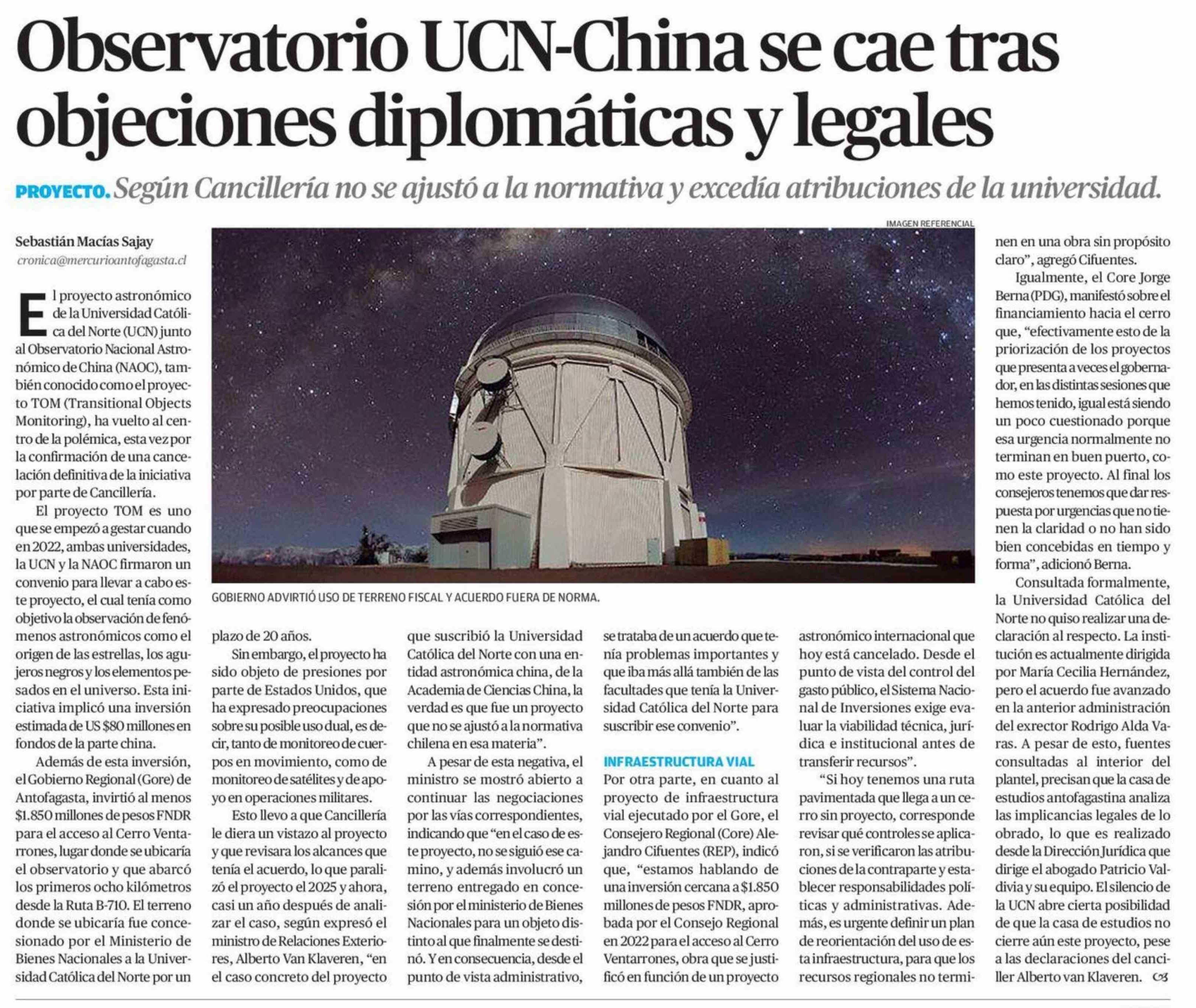 Observatorio UCN-China se cae tras objeciones diplomáticas y legales