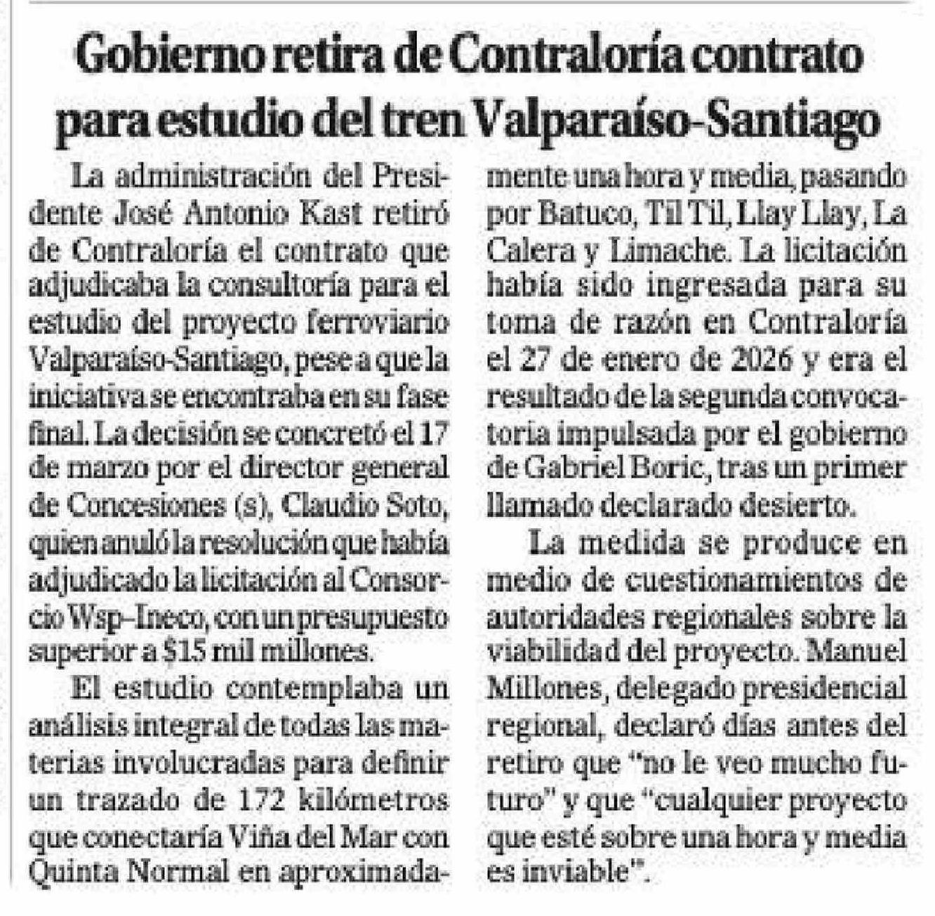 Gobierno retira de Contraloría contrato para estudio del tren Valparaíso-Santiago