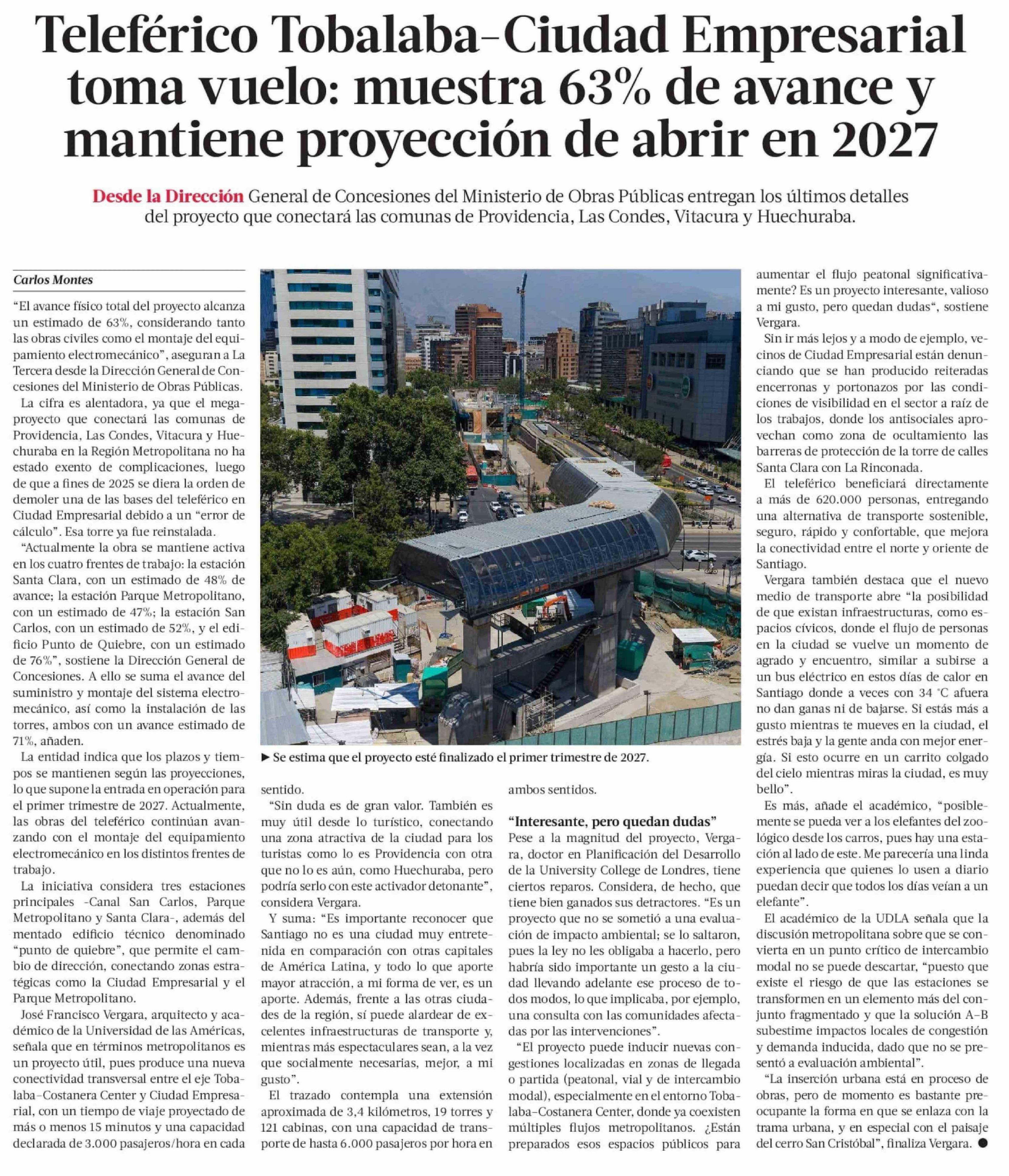 Teleférico Tobalaba-Ciudad Empresarial toma vuelo: muestra 63% de avance y mantiene proyección de abrir en 2027