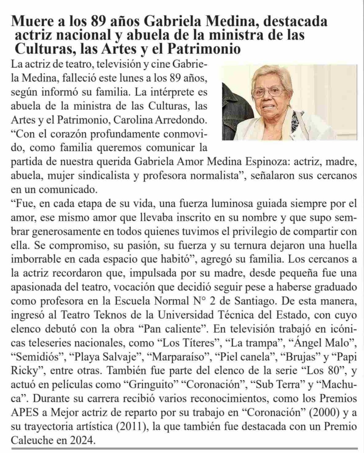 Muere a los 89 años Gabriela Medina, destacada actriz nacional y abuela de la ministra de las Culturas, las Artes y el Patrimonio
