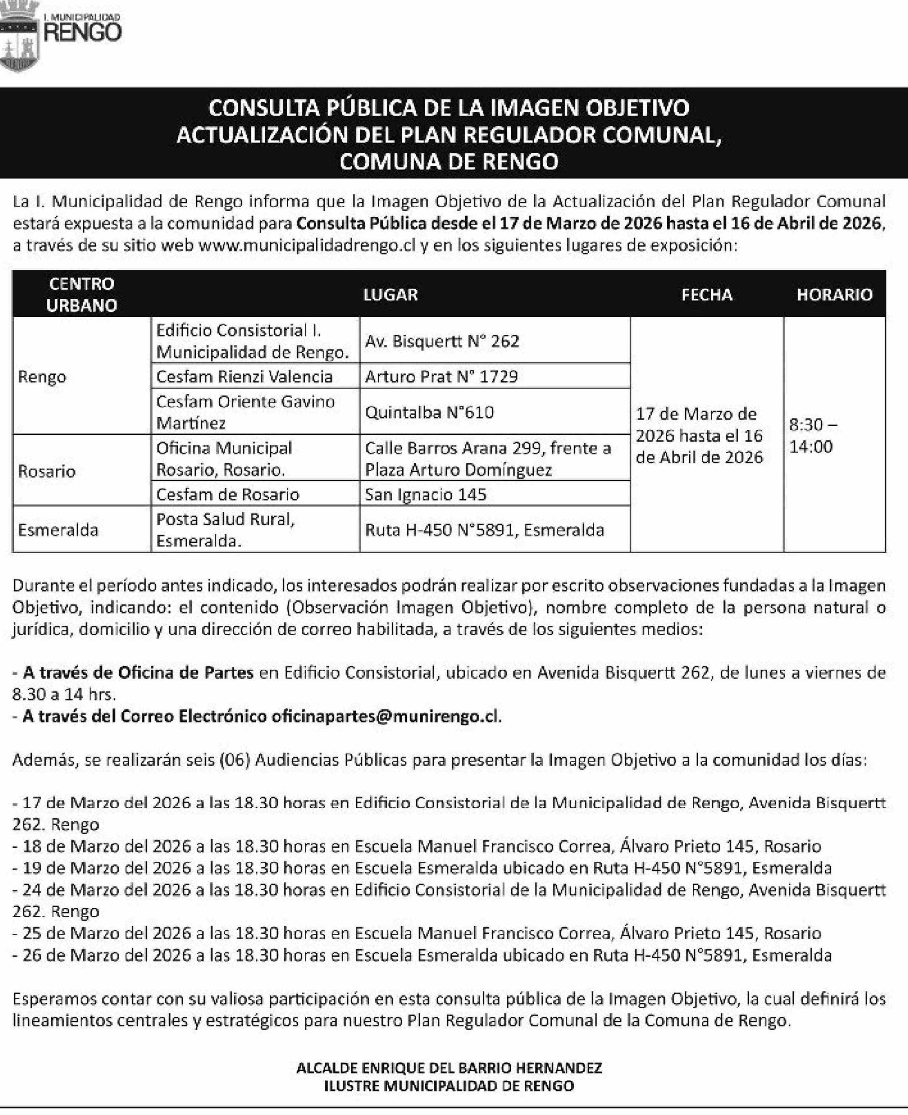 Aviso Licitaciones: CONSULTA PÚBLICA DE LA IMAGEN OBJETIVO ACTUALIZACIÓN DEL PLAN REGULADOR COMUNAL, COMUNA DE RENGO