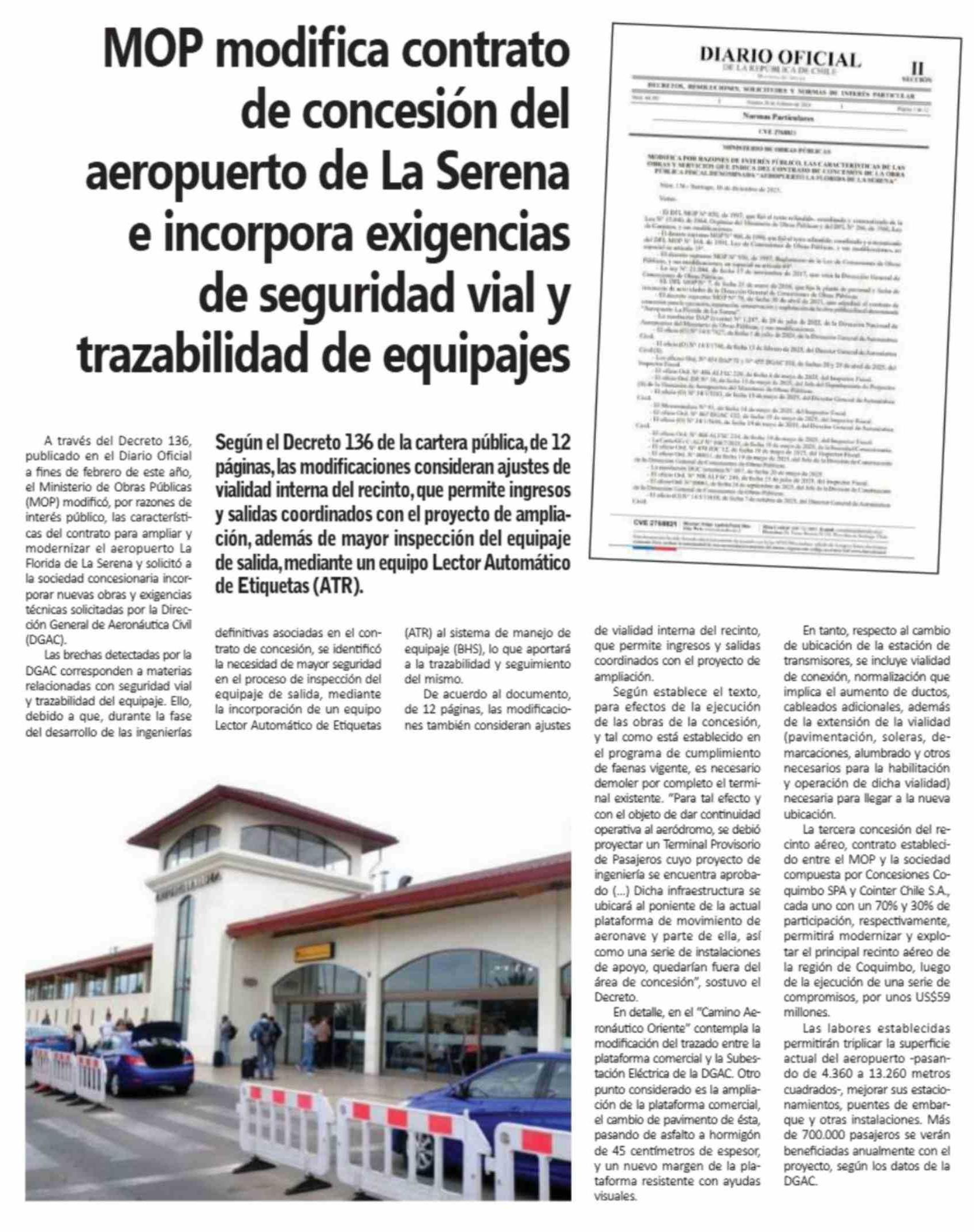 Título: MOP modifica contrato de concesión del aeropuerto de La Serena e incorpora exigencias de seguridad vial y trazabilidad de equipajes