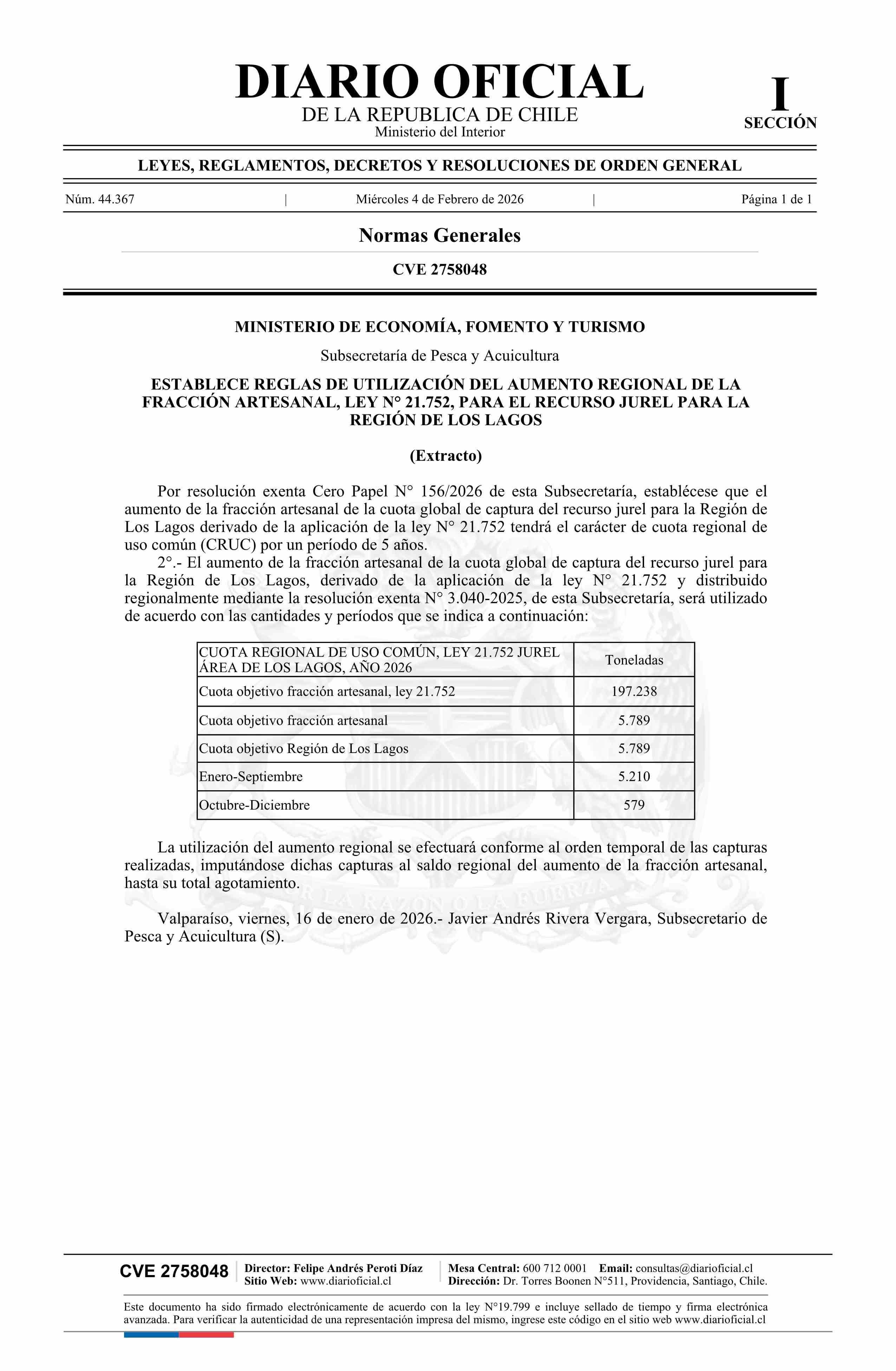 | Título: | Extracto de resolución exenta número 156, de 2026.- Establece reglas de utilización del aumento regional de la fracción artesanal, ley N° 21.752, para el recurso Jurel para la Región de Los Lagos |