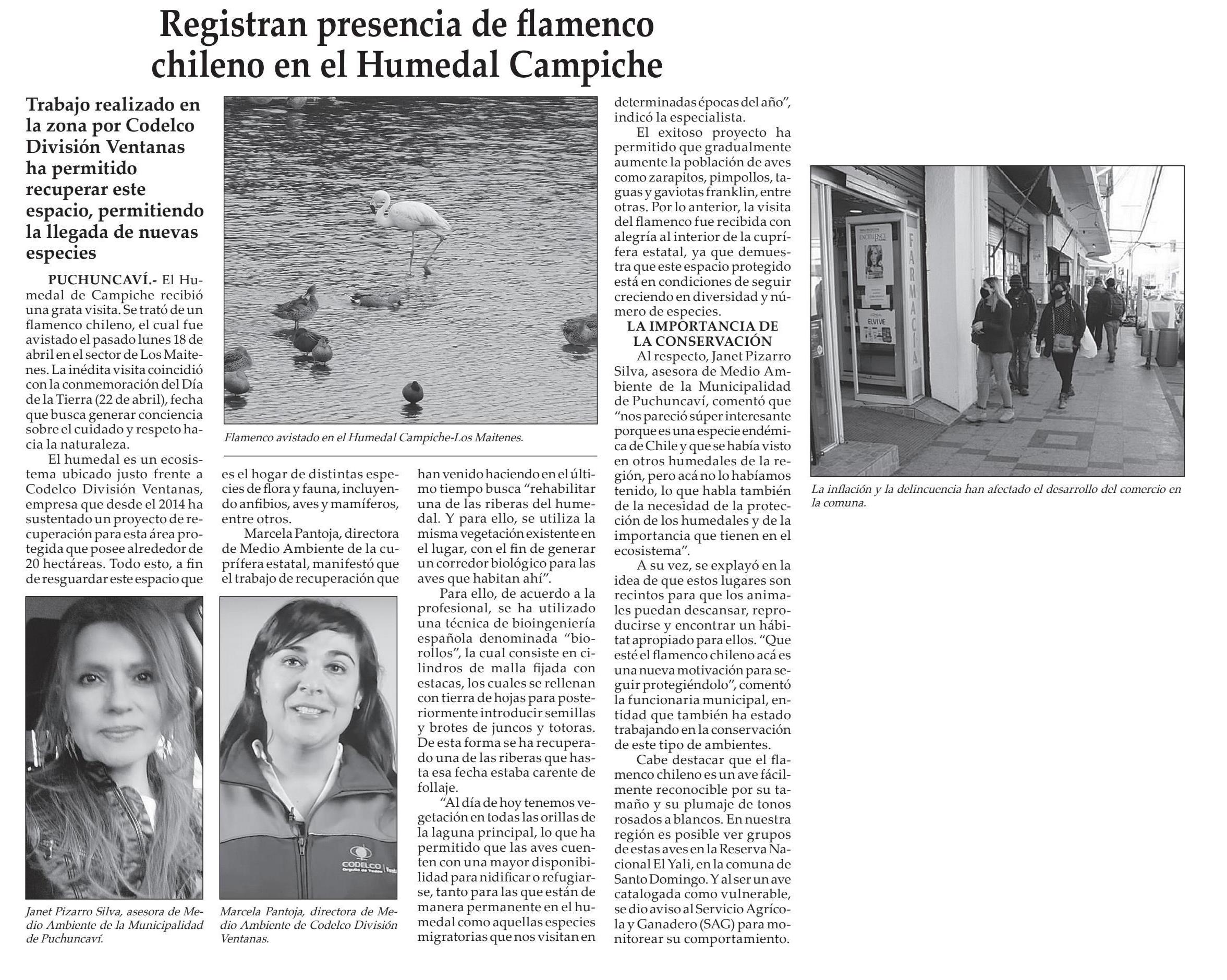 Registran presencia de flamenco chileno en el Humedal Campiche