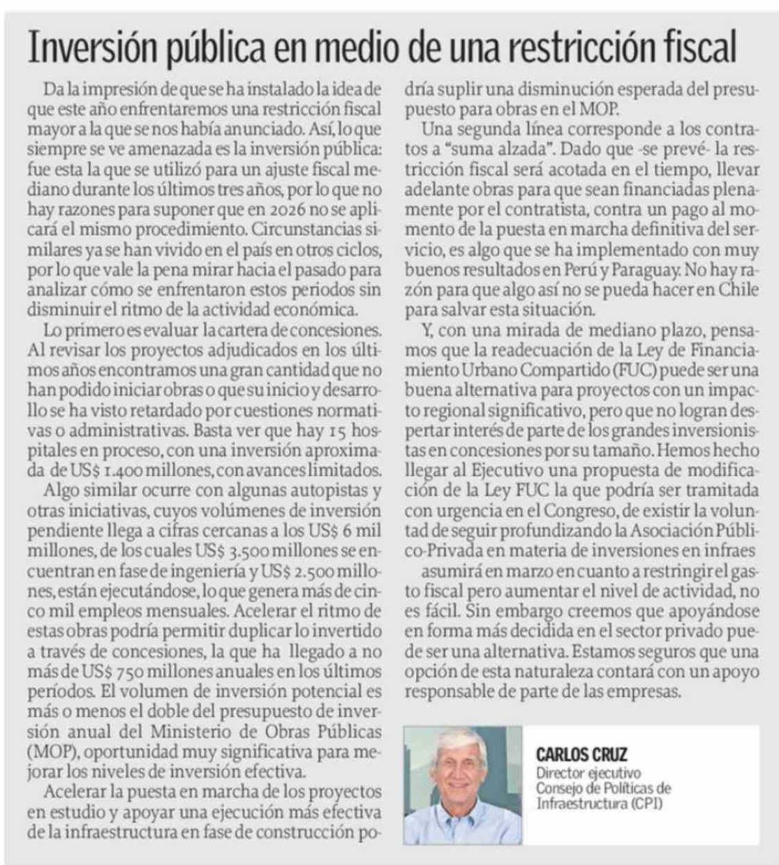Columnas de Opinión: Inversión pública en medio de una restricción fiscal