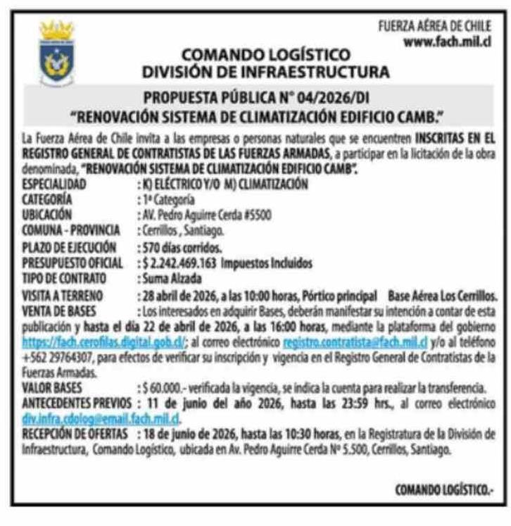 AVISO LICITACIONES: COMANDO LOGÍSTICO DIVISIÓN DE INFRAESTRUCTURA