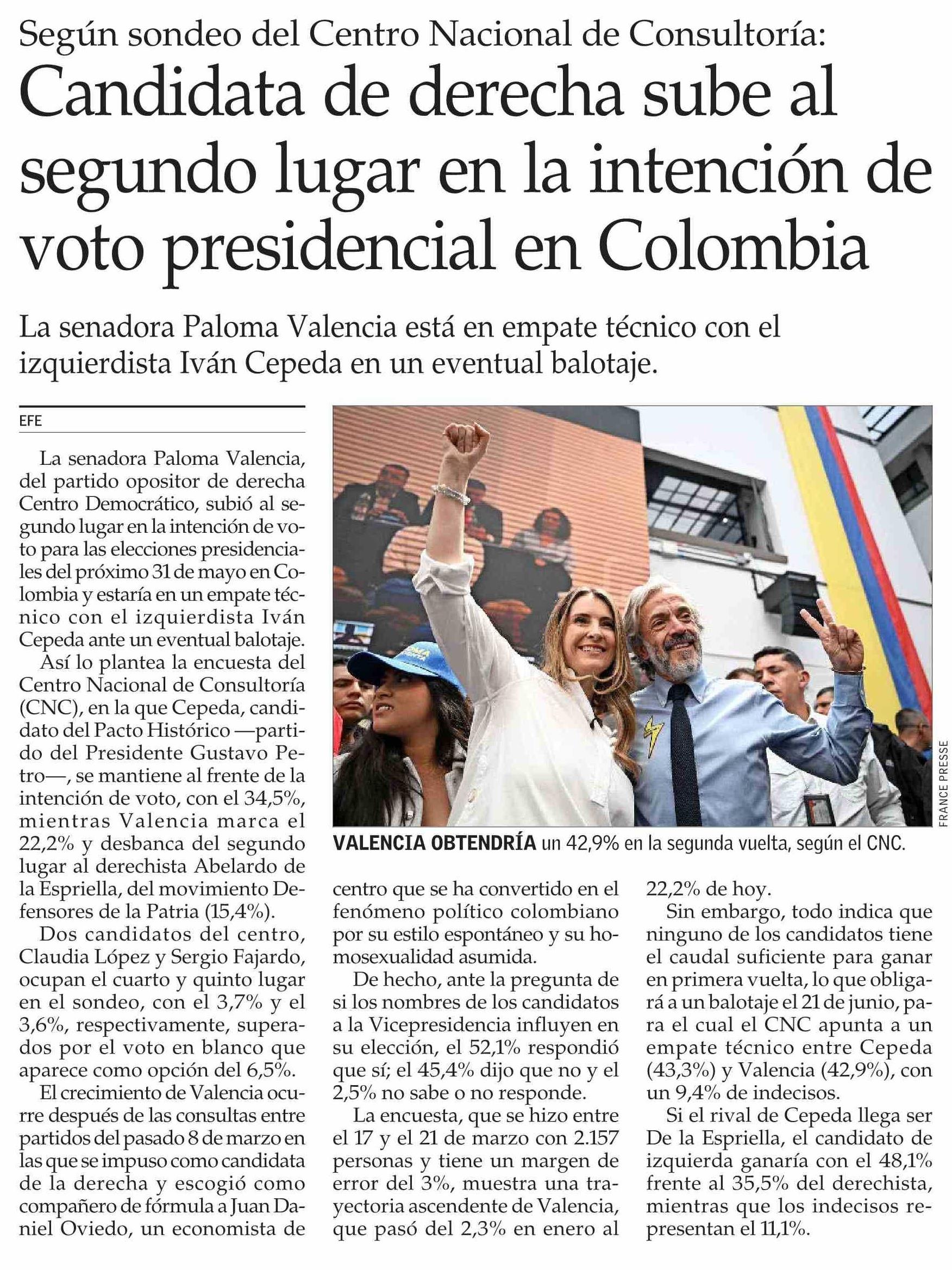 Candidata de derecha sube al segundo lugar en la intención de voto presidencial en Colombia