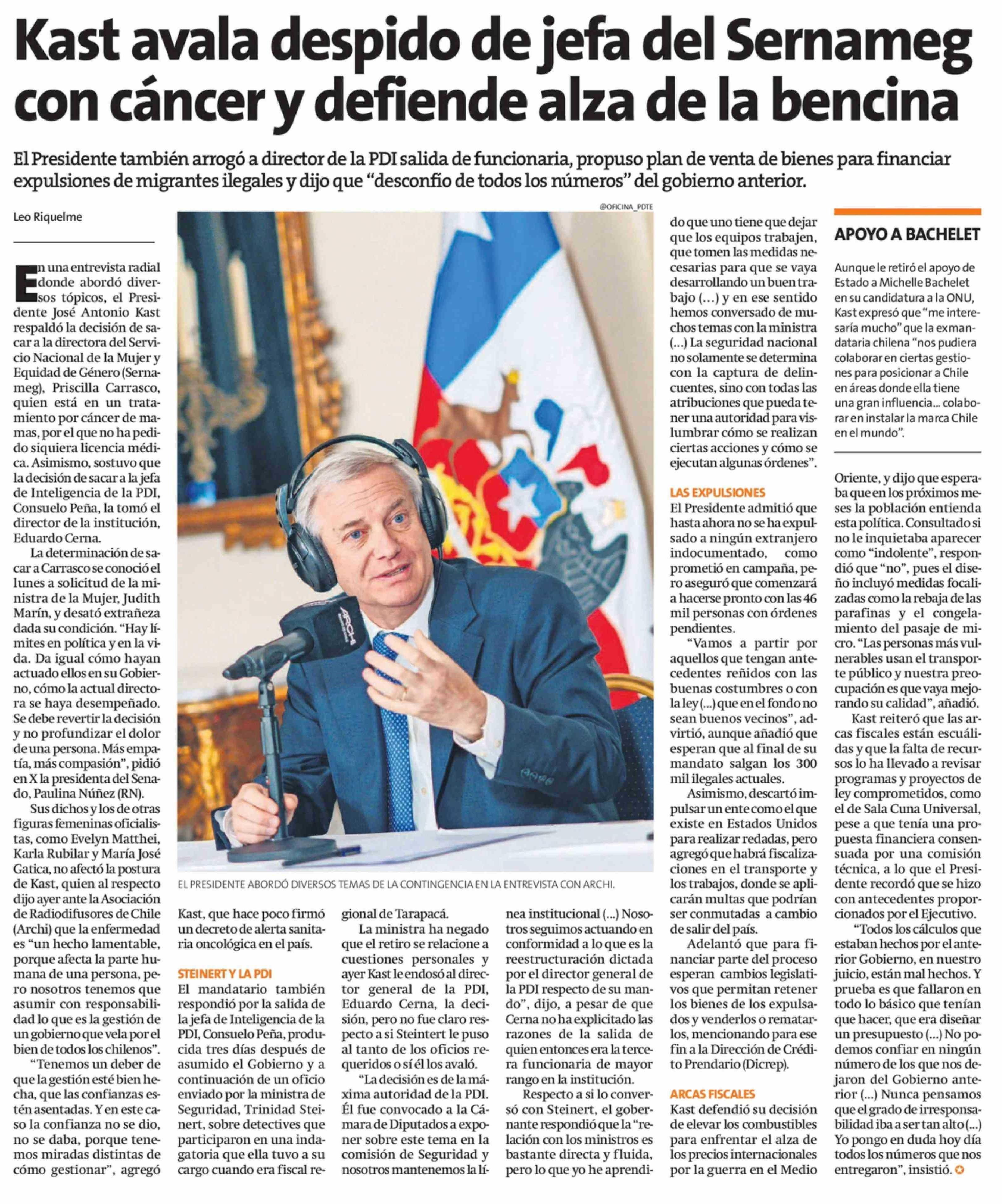 Kast avala despido de jefa del Sernameg con cáncer y defiende alza de la bencina