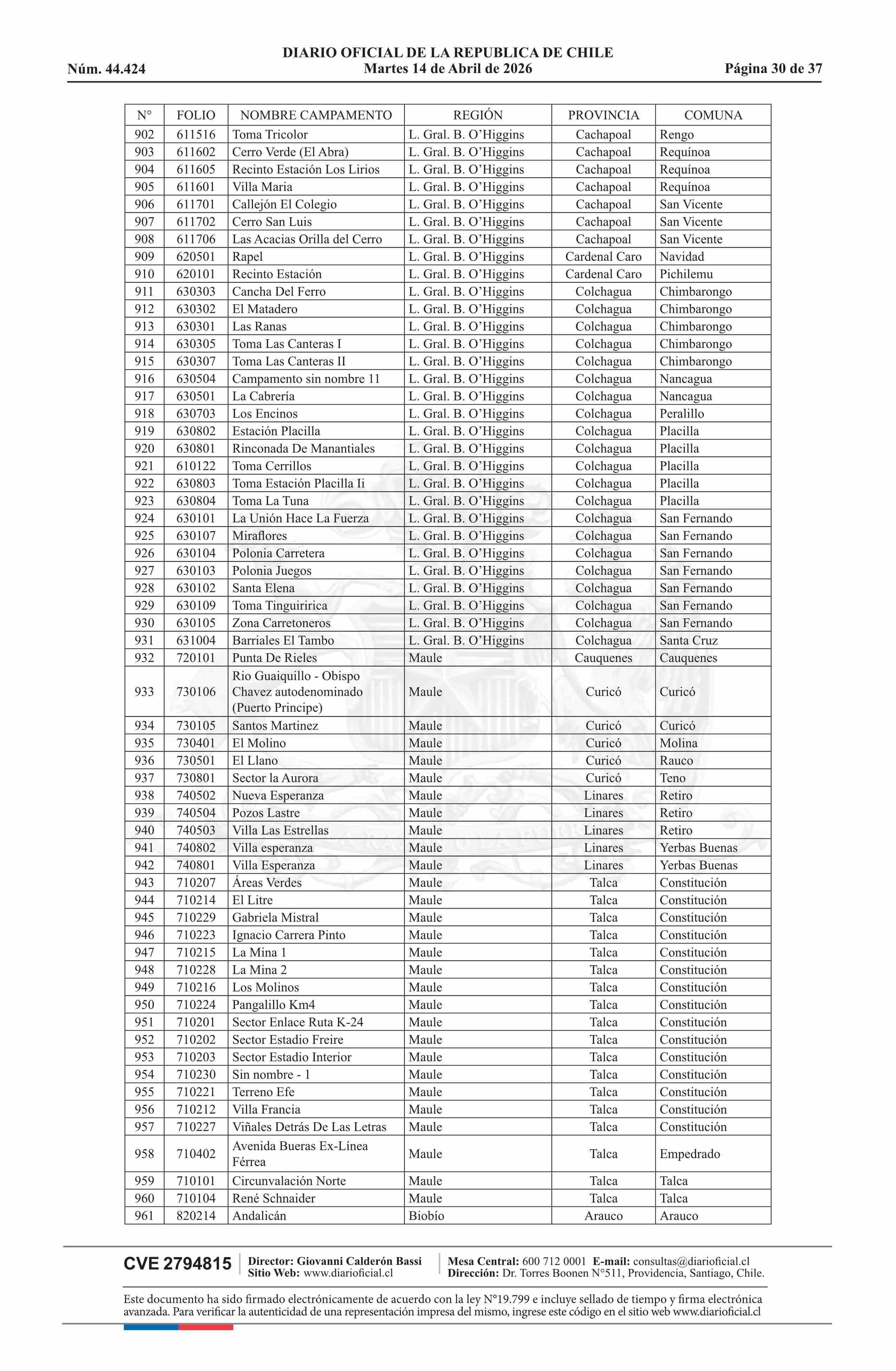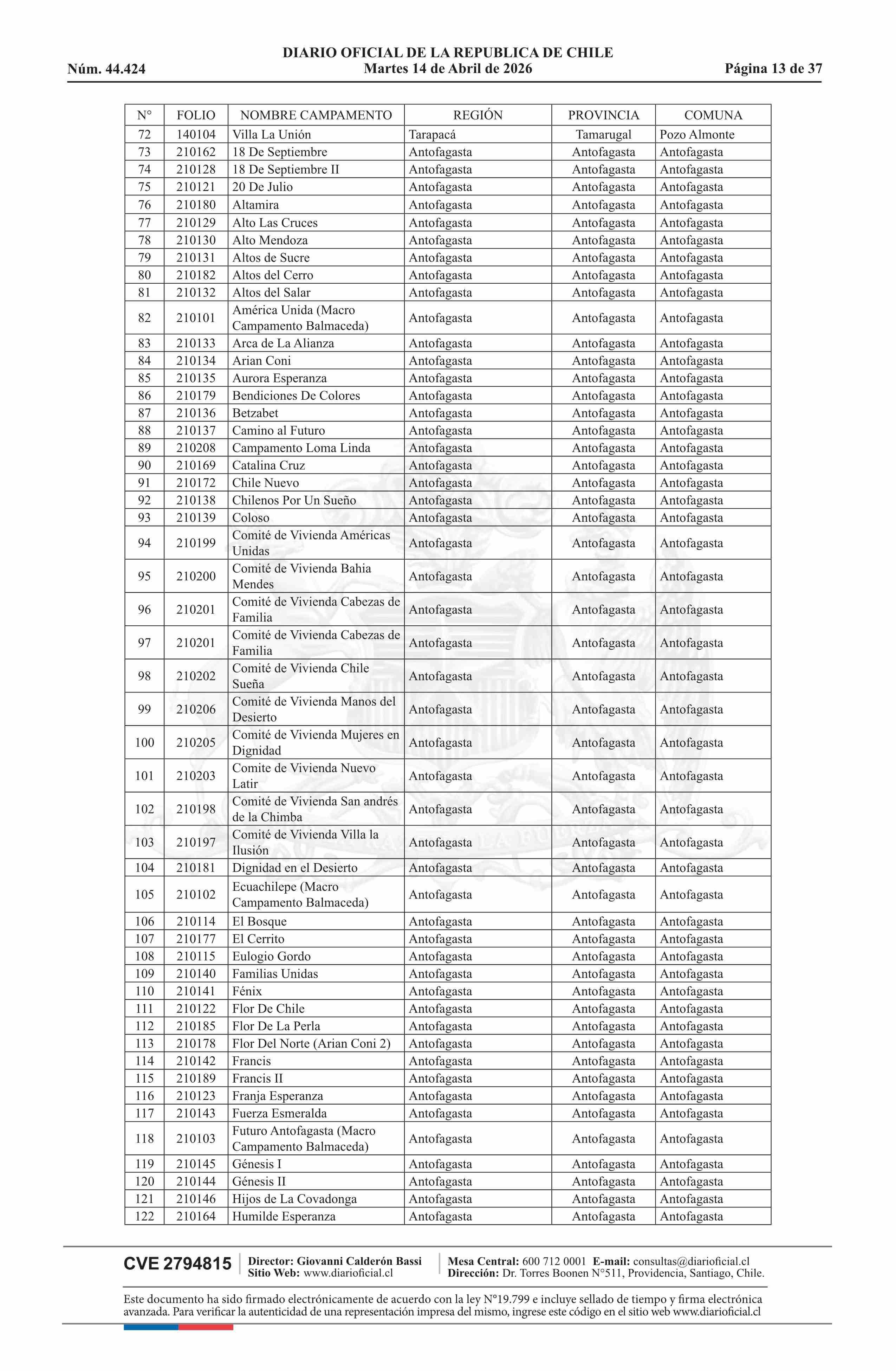 | Título: | Resolución exenta número 377, de 2026.- Aprueba actualización del Registro Histórico de Campamentos y actualización del Registro Vigente de Campamentos, del Catastro de Asentamientos Precarios al 27 de febrero de 2026, y revoca las resoluciones N°s. 335 y 713 exentas, de 2024 |