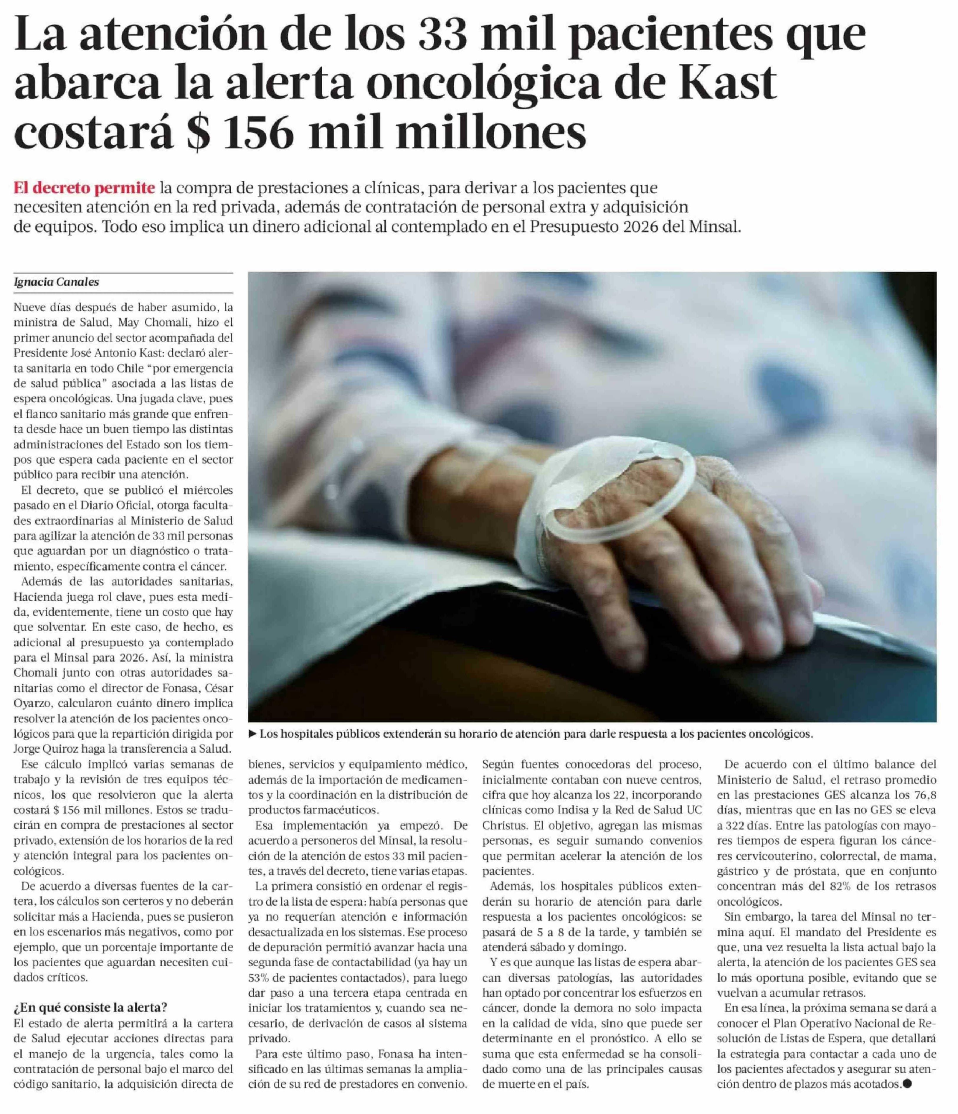 La atención de los 33 mil pacientes que abarca la alerta oncológica de Kast costará $ 156 mil millones