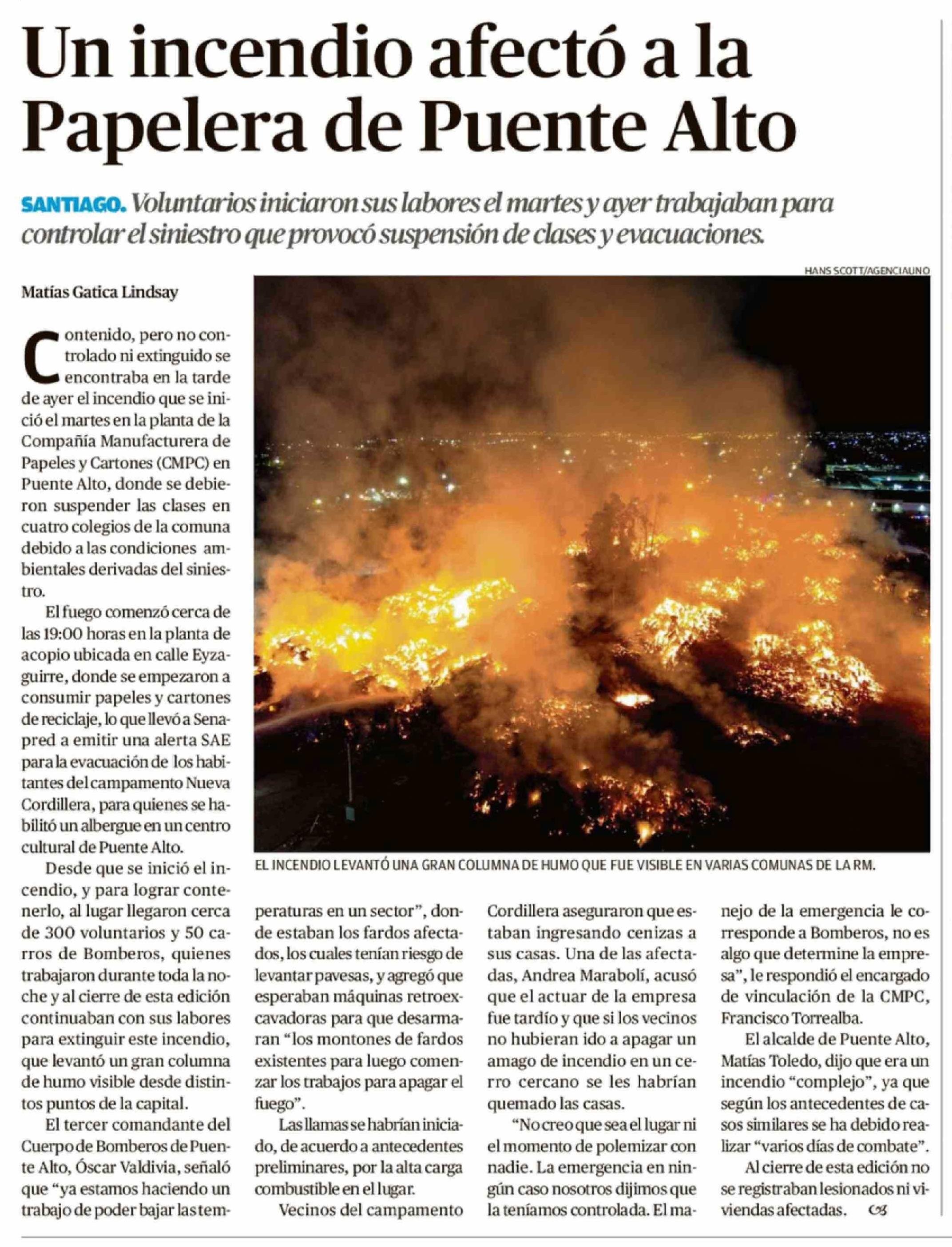 Un incendio afectó a la Papelera de Puente Alto