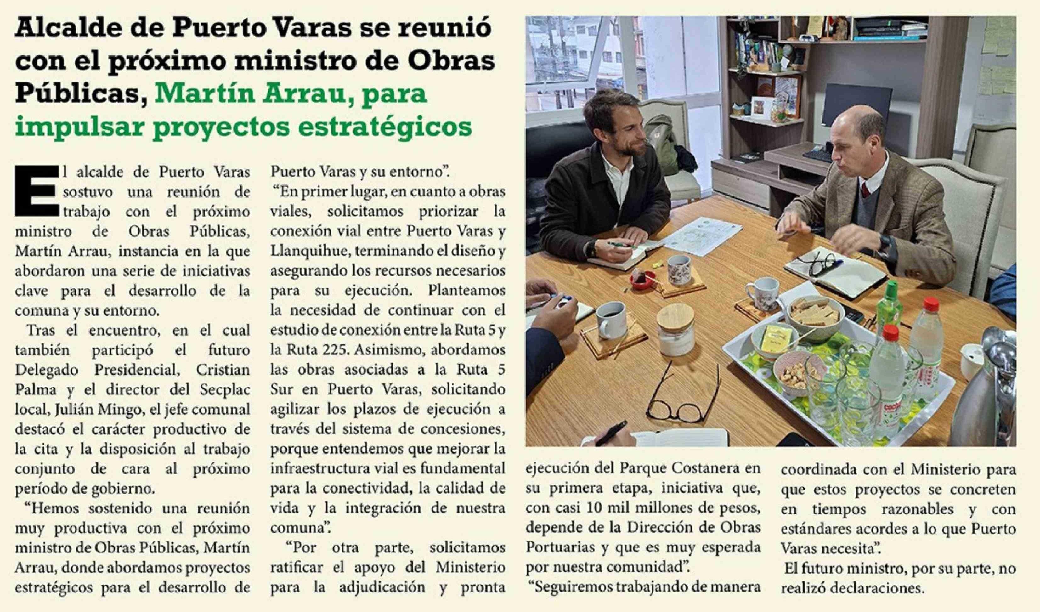 Alcalde de Puerto Varas se reunió con el próximo ministro de Obras Públicas, Martín Arrau, para impulsar proyectos estratégicos