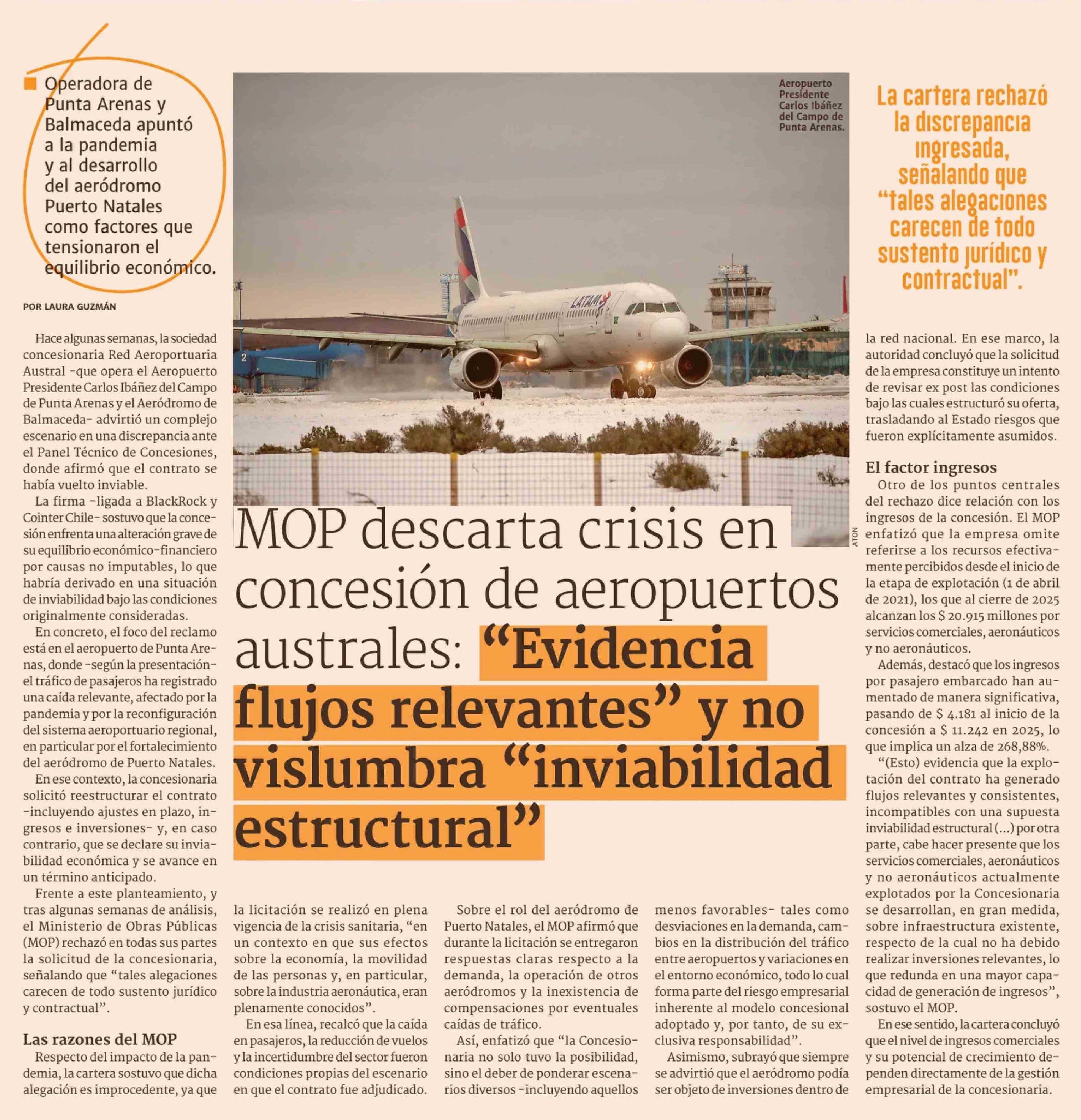 MOP descarta crisis en concesión de aeropuertos australes: "Evidencia flujos relevantes" y no vislumbra "inviabilidad estructural"