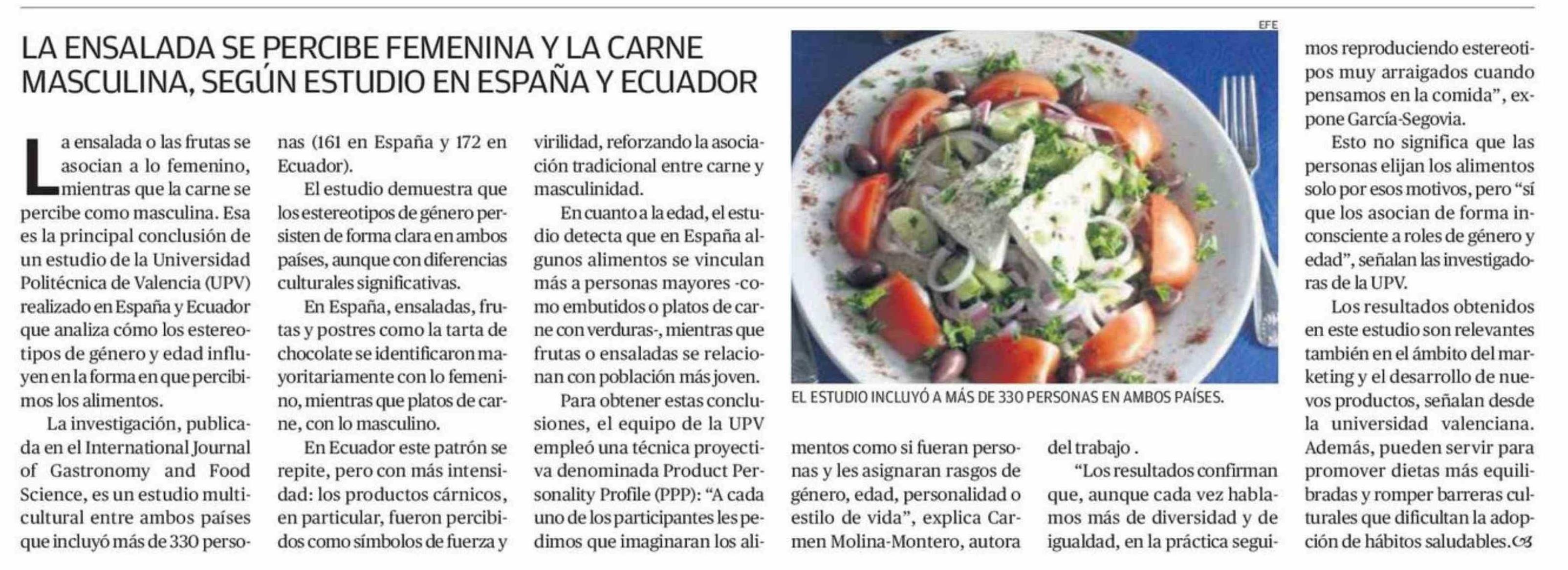 LA ENSALADA SE PERCIBE FEMENINA Y LA CARNE MASCULINA, SEGÚN ESTUDIO EN ESPAÑA Y ECUADOR