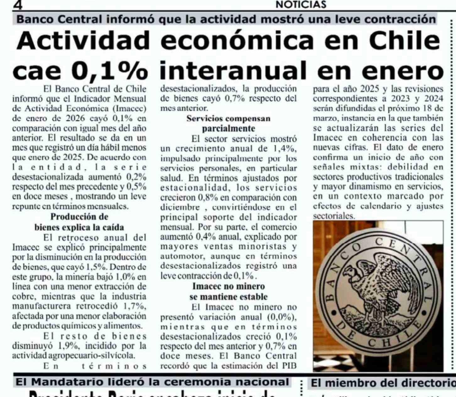 Actividad económica en Chile cae 0,1% interanual en enero