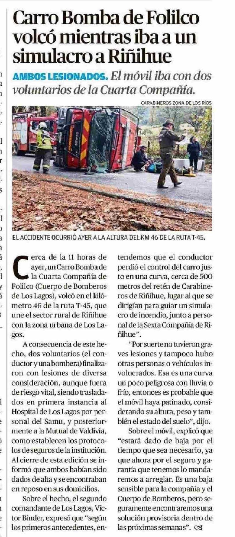 Carro Bomba de Folilco volcó mientras ibaa un simulacro a Riñihue