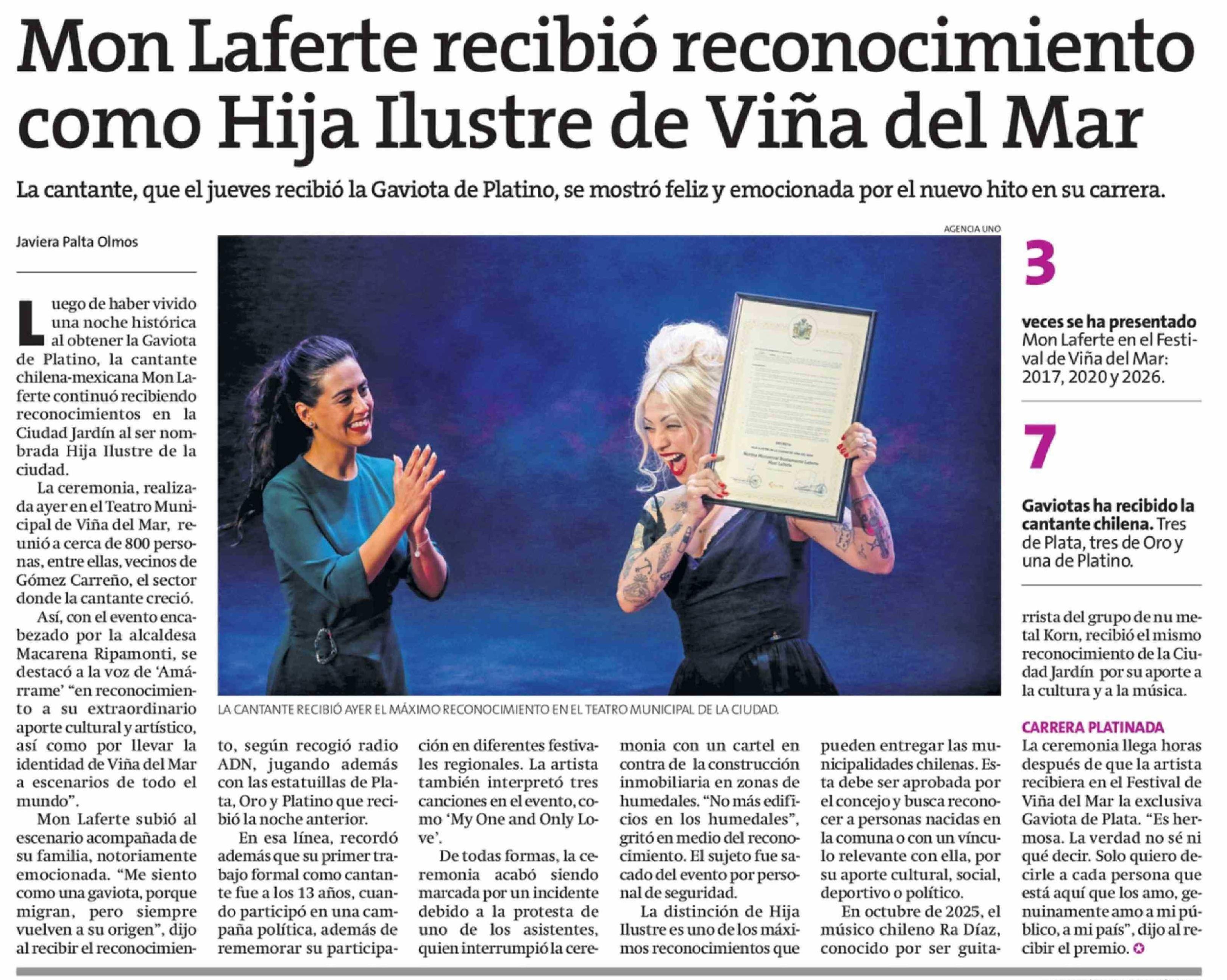 Mon Laferte recibió reconocimiento como Hija Ilustre de Viña del Mar