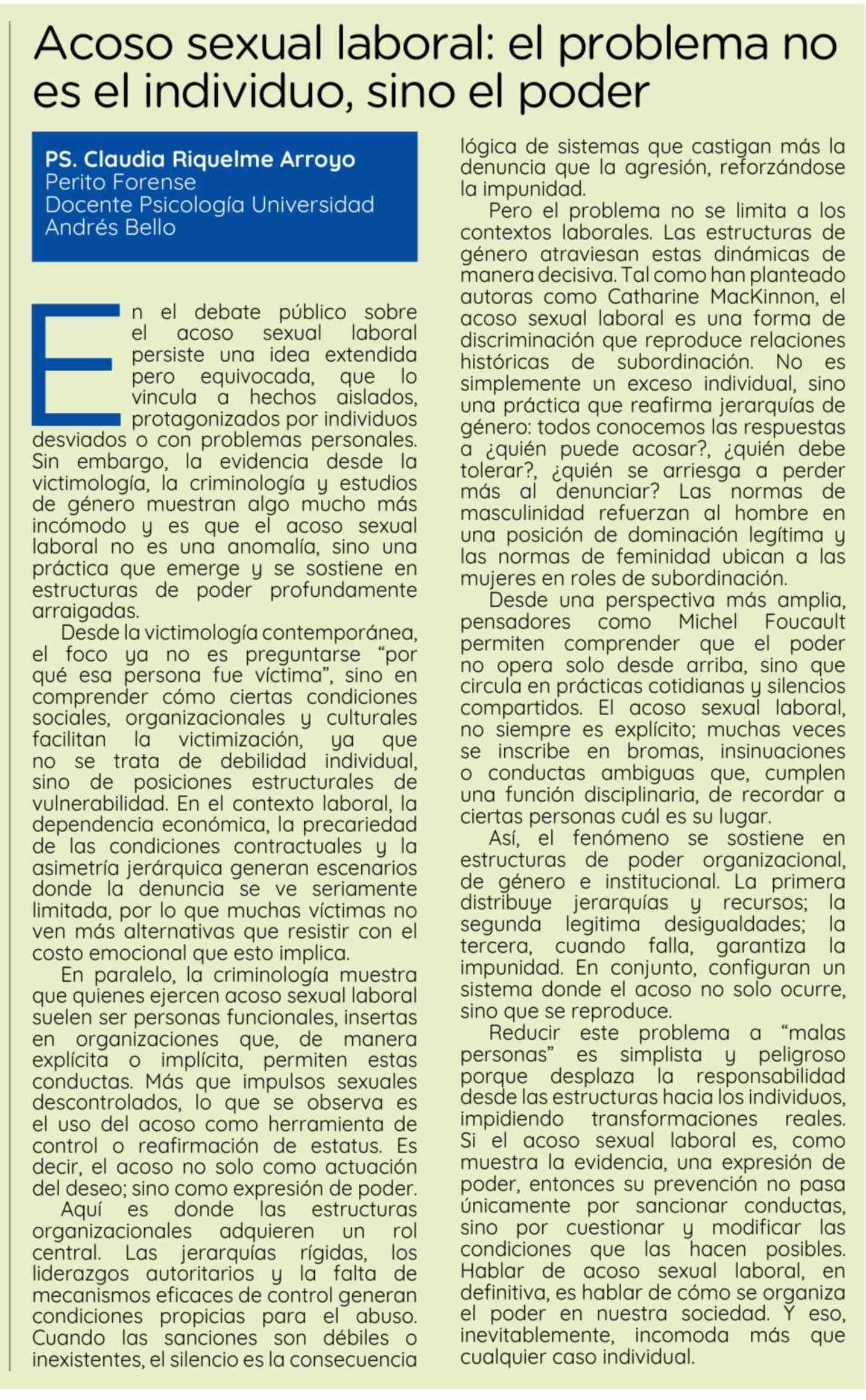 Columnas de Opinión: Acoso sexual laboral: el problema no es el individuo, sino el poder