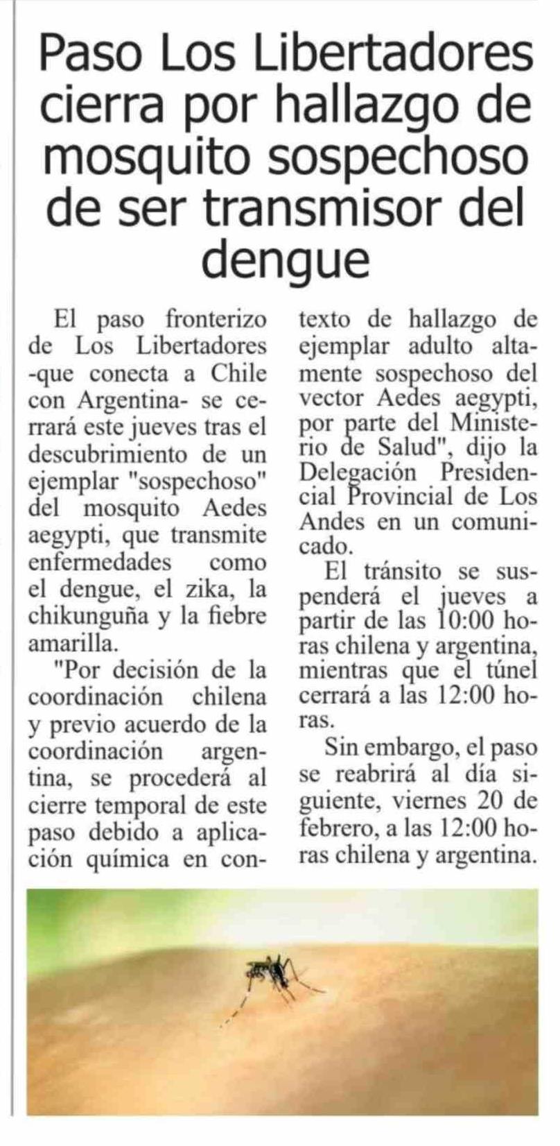 Paso Los Libertadores cierra por hallazgo de mosquito sospechoso de ser transmisor del dengue