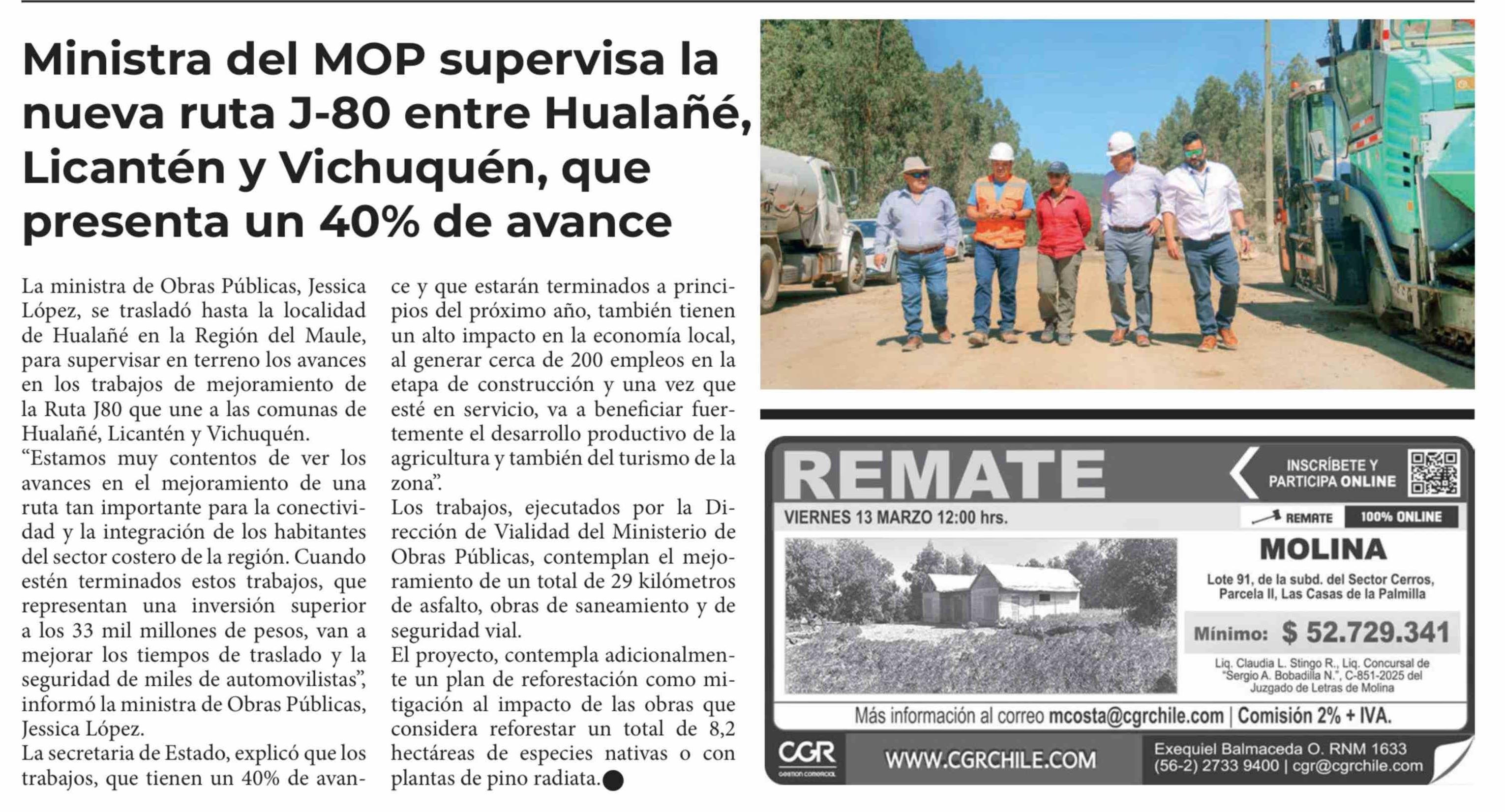 Ministra del MOP supervisa la nueva ruta J-80 entre Hualañé, Licantén y Vichuquén, que presenta un 40% de avance
