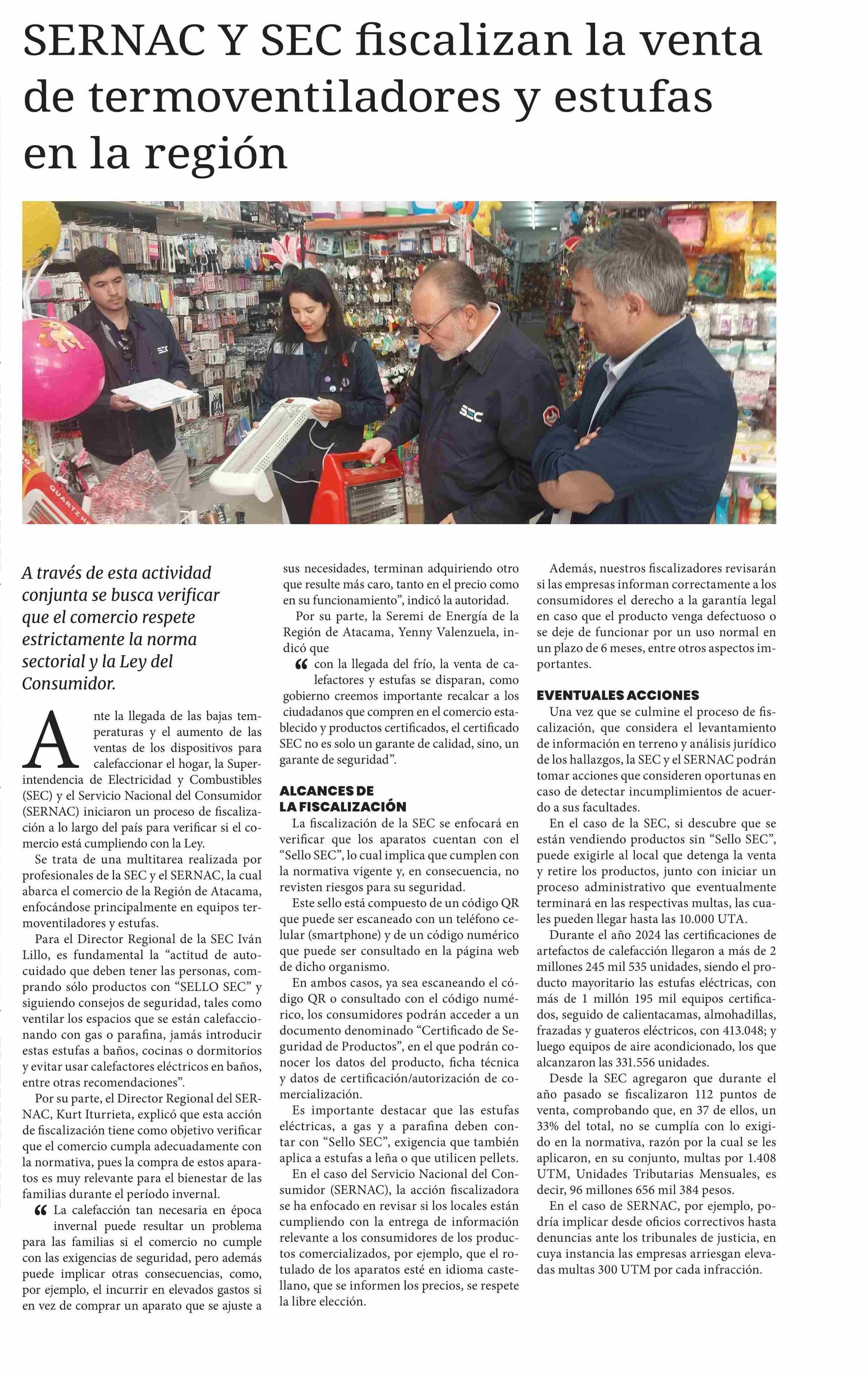 SERNAC Y SEC fiscalizan la venta de termoventiladores y estufas en la región