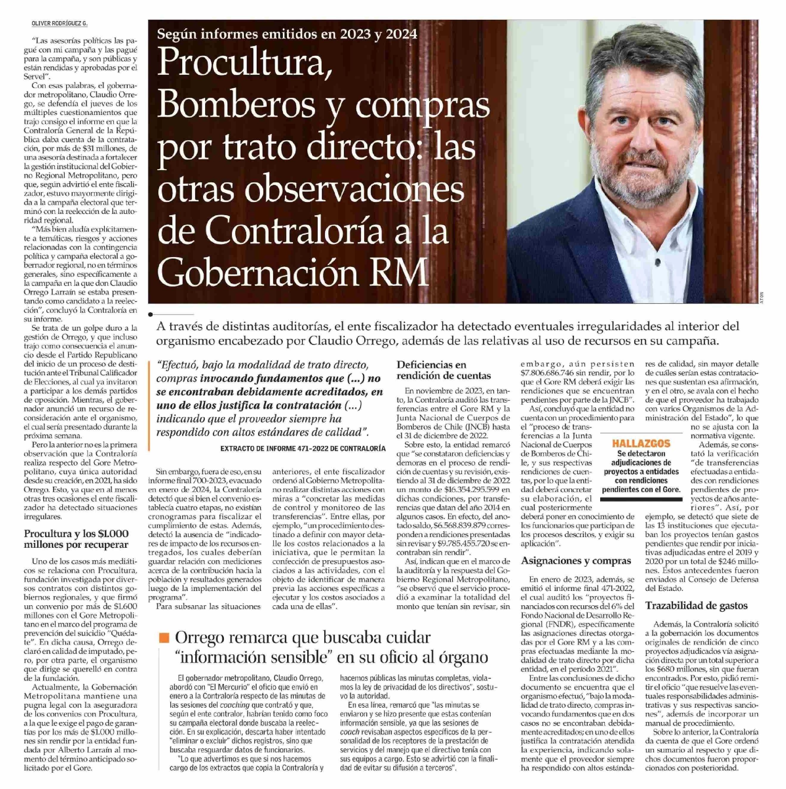 Procultura, Bomberos y compras por trato directo; las otras observaciones de Contraloría a lla Gobernación RM