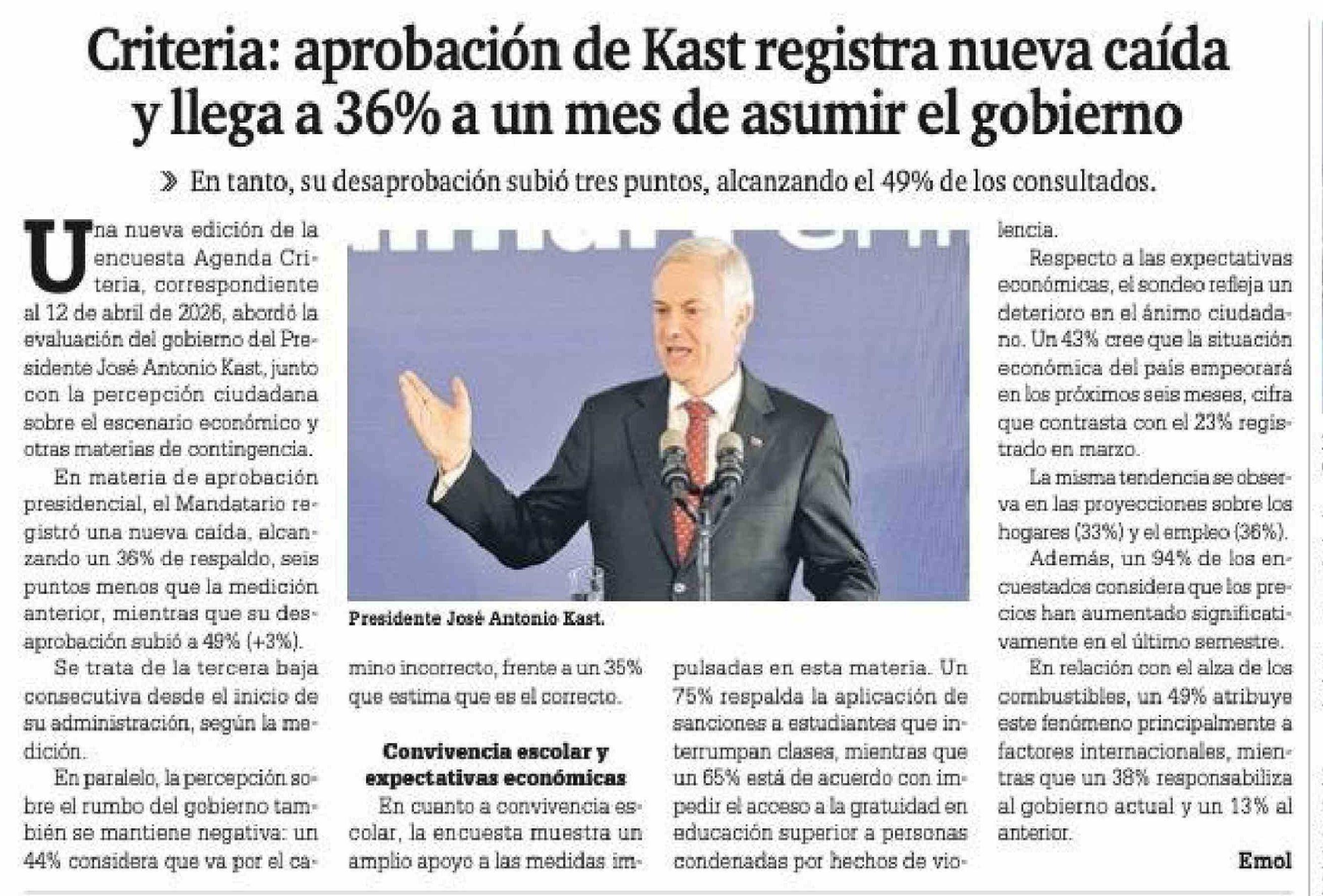 Criteria: aprobación de Kast registra nueva caída y llega a 36% a un mes de asumir el gobierno