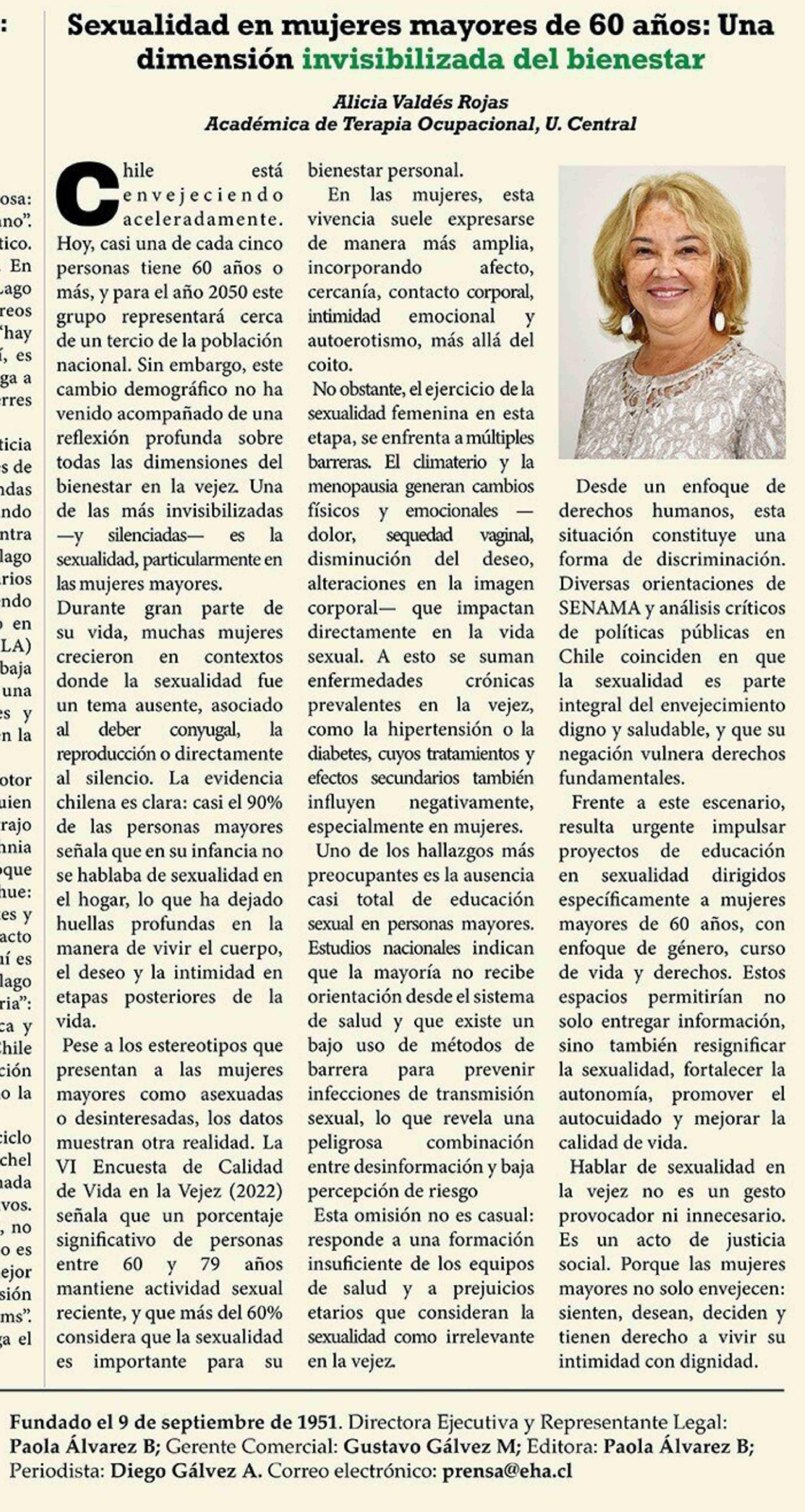 Columnas de Opinión: Sexualidad en mujeres mayores de 60 años: Una dimensión invisibilizada del bienestar