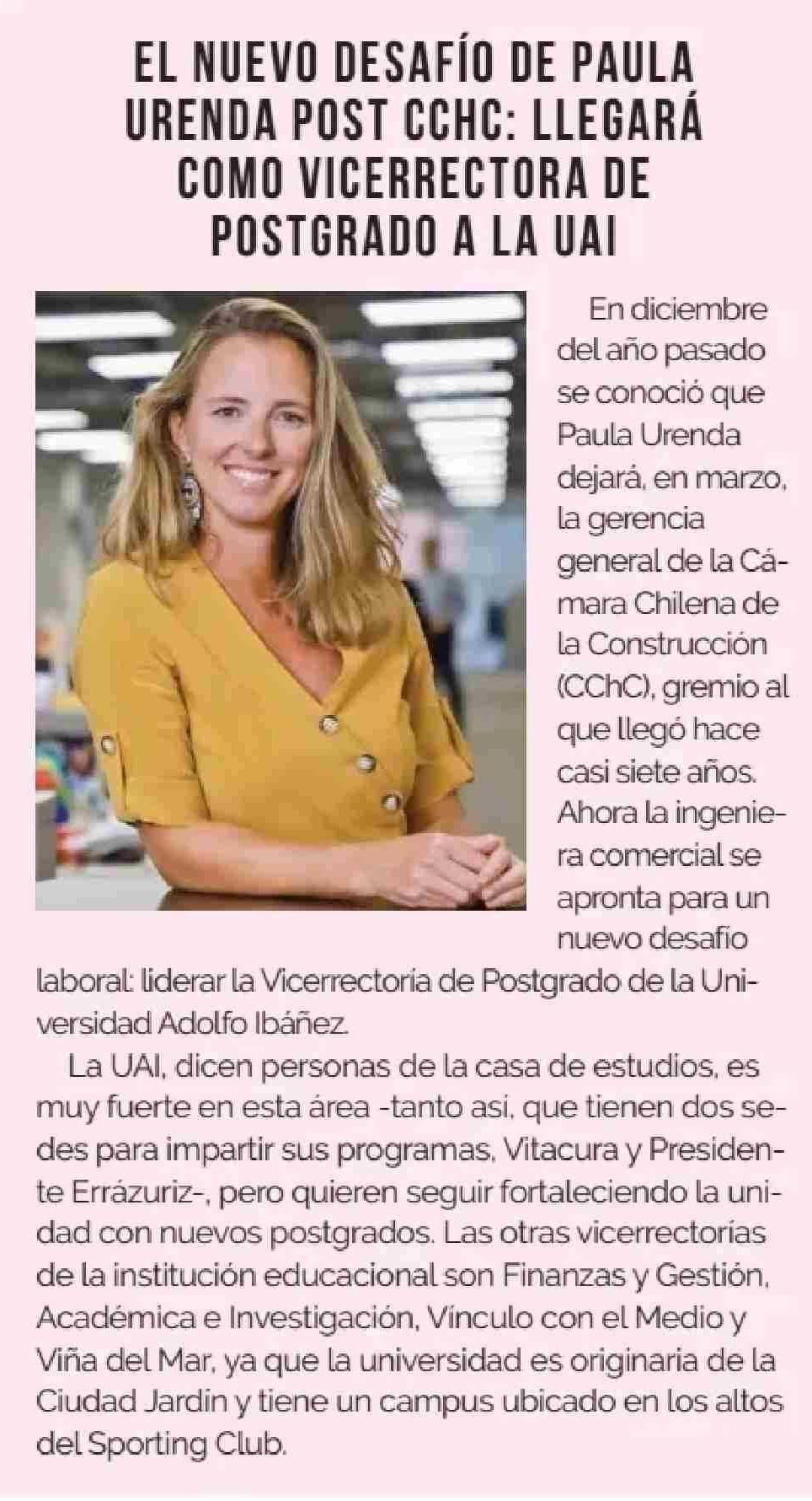 EL NUEVO DESAFÍO DE PAULA URENDA POST CCHC: LLEGARÁ COMO VICERRECTORA DE POSTGRADO ALA UAI