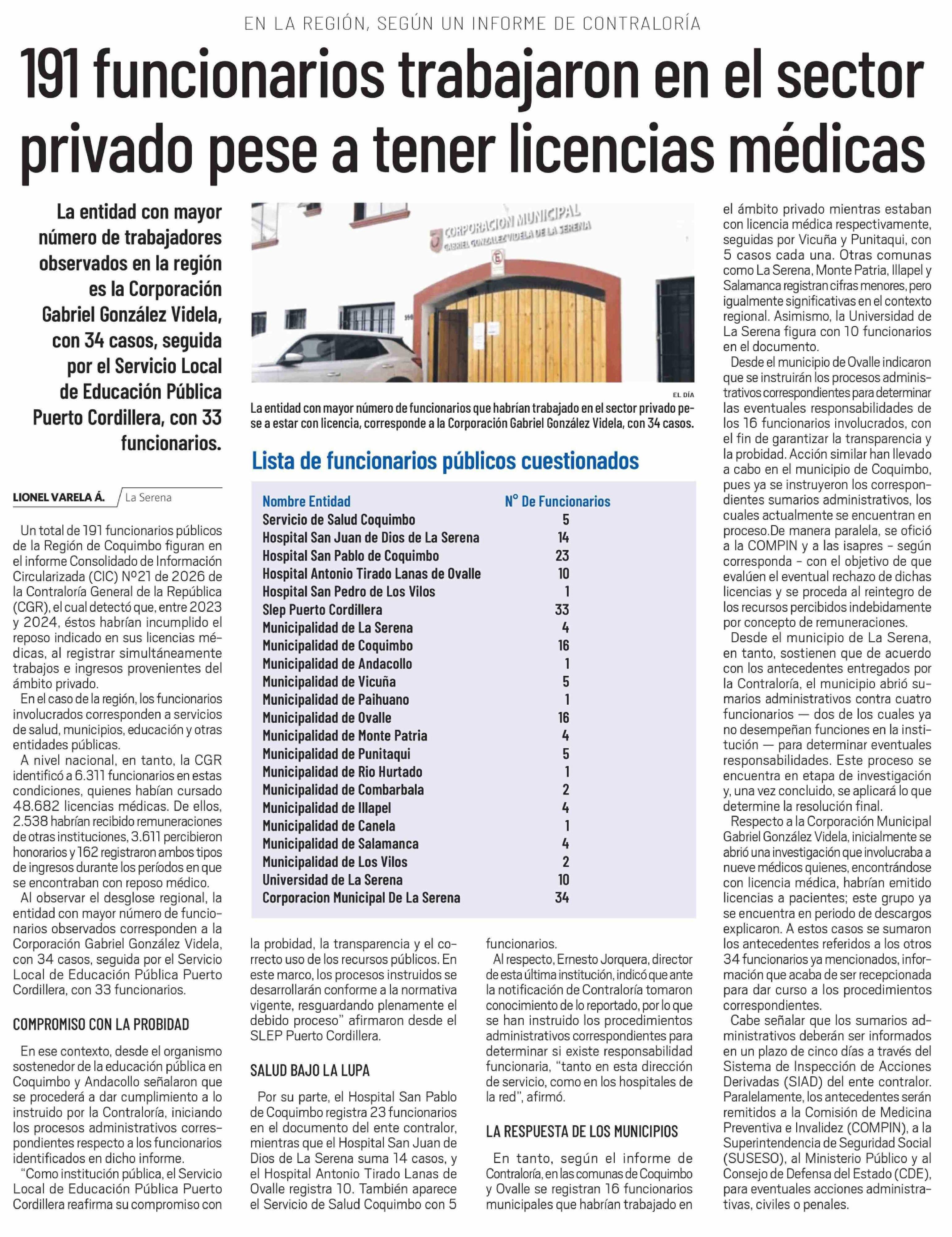 191 Funcionarios trabajaron en el sector privado pese a tener licencias médicas