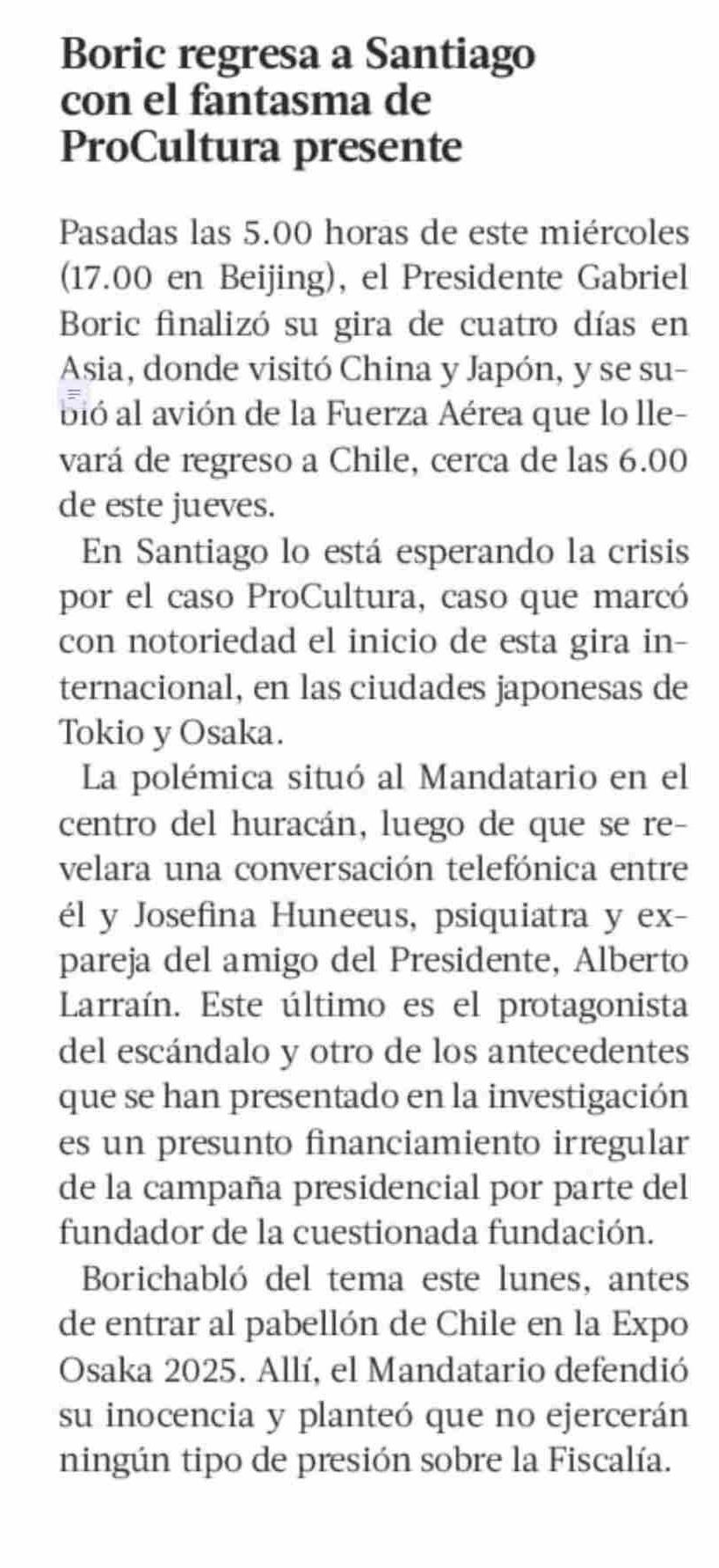 Boric regresa a Santiago con el fantasma de ProCultura presente