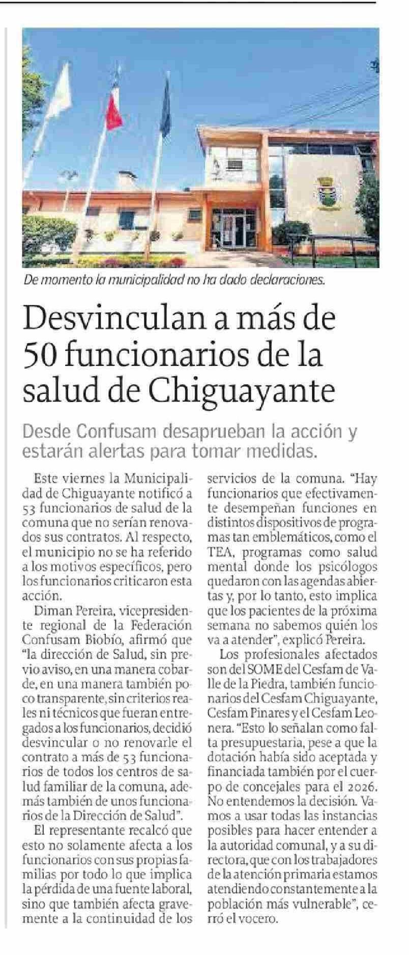Desvinculan a más de 50 funcionarios de la salud de Chiguayante