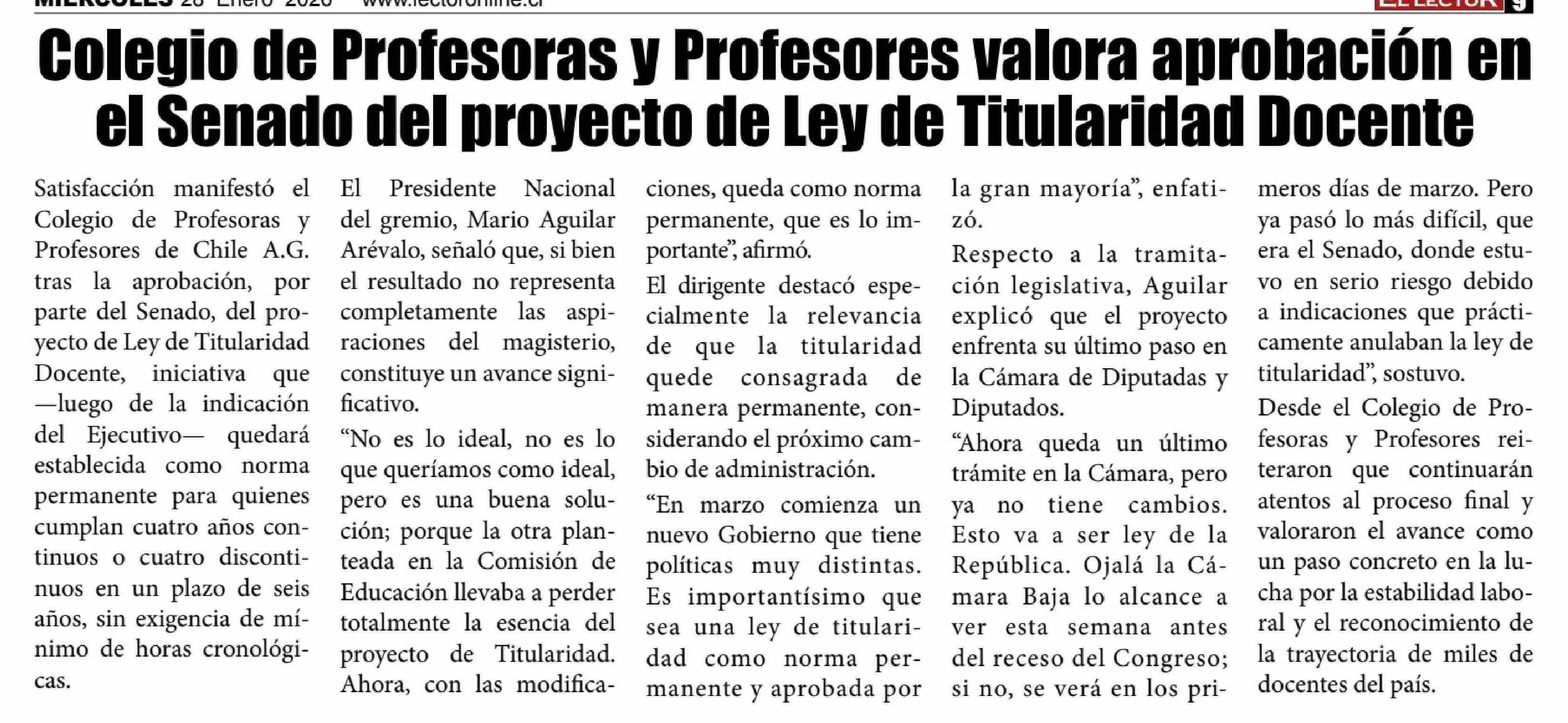Colegio de Profesoras y Profesores valora aprobación en el Senado del proyecto de Ley de Titularidad Docente