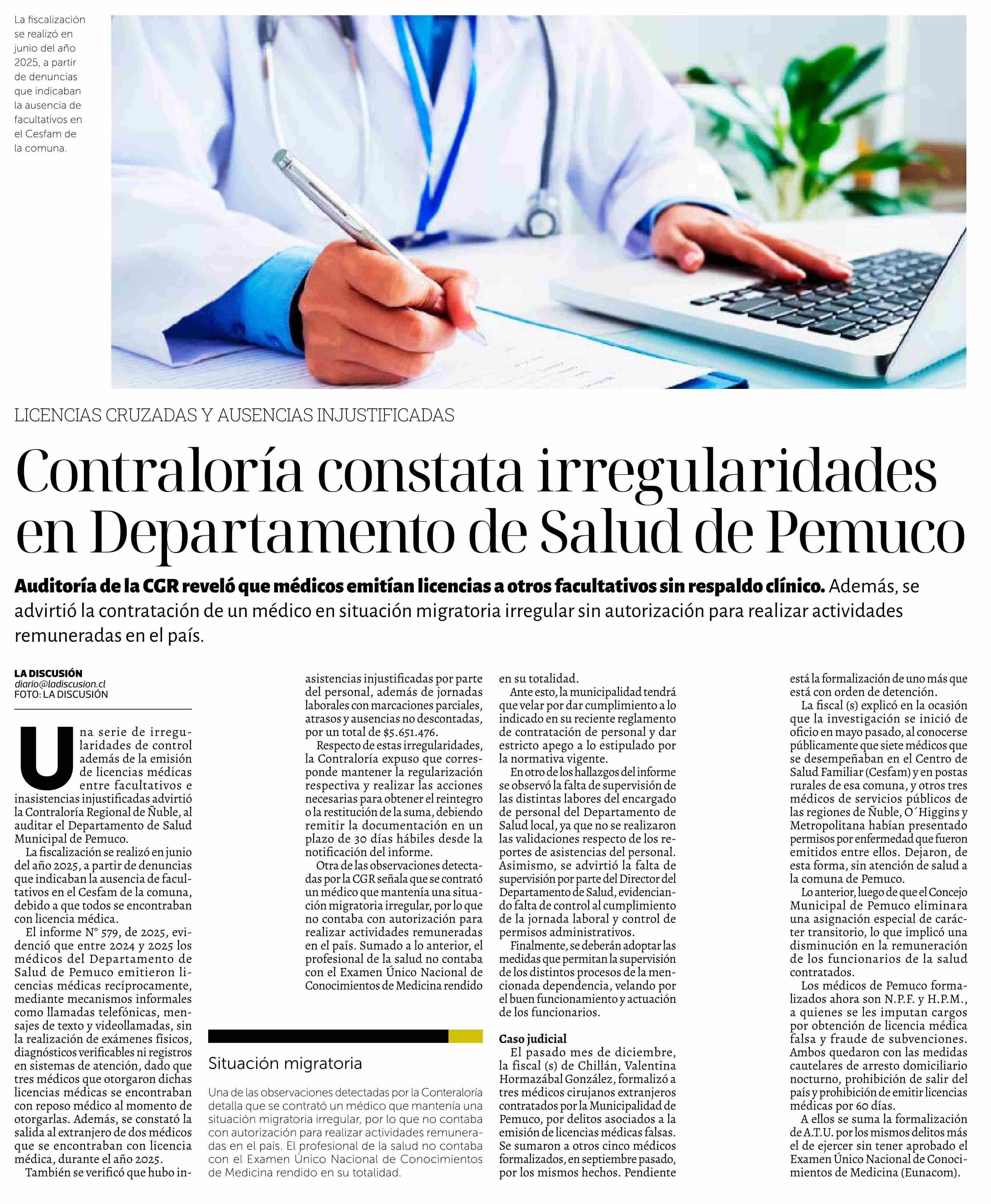 Contraloría constata irregularidades en Departamento de Salud de Pemuco