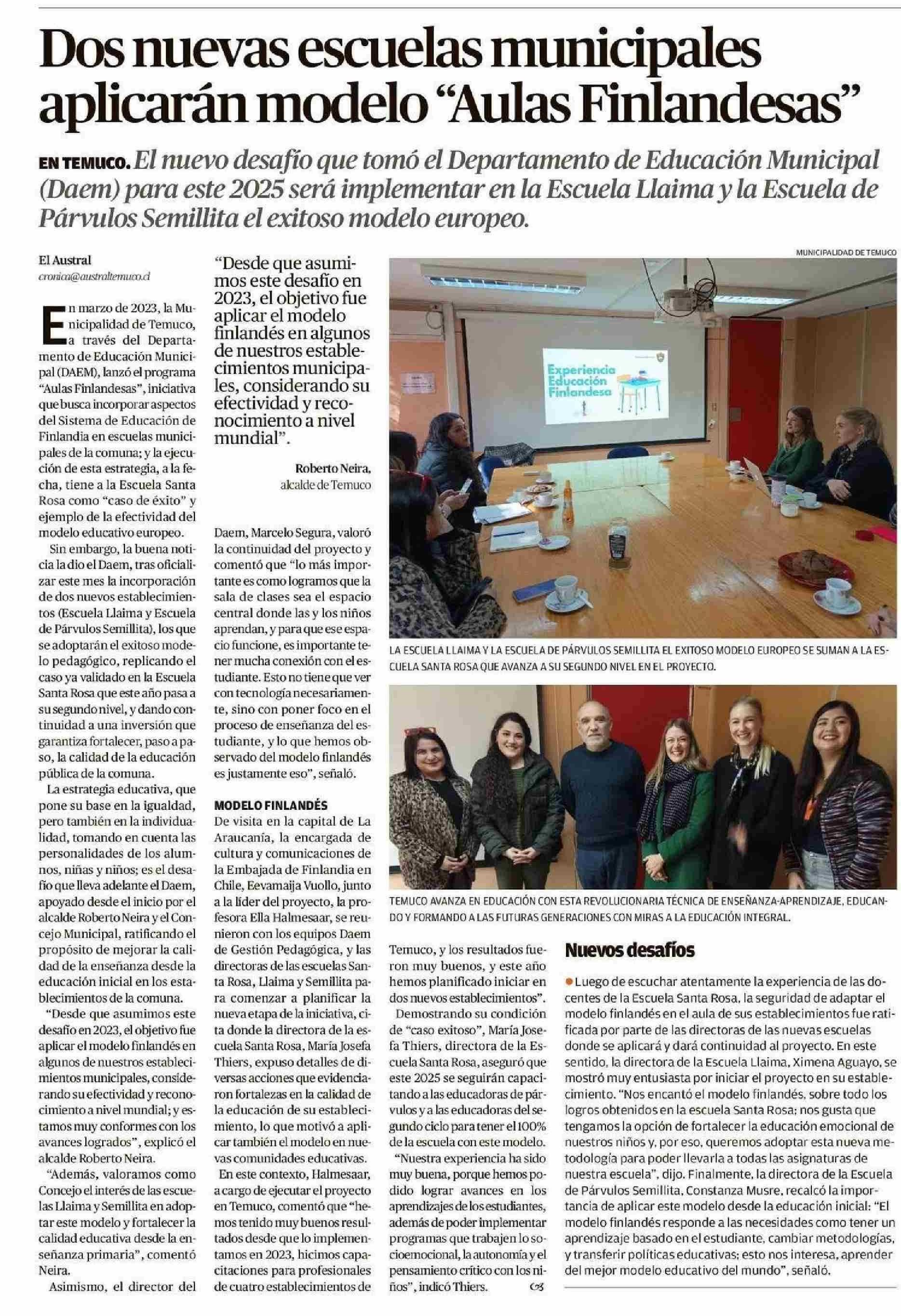 Dos nuevas escuelas municipales aplicarán modelo "Aulas Finlandesas"