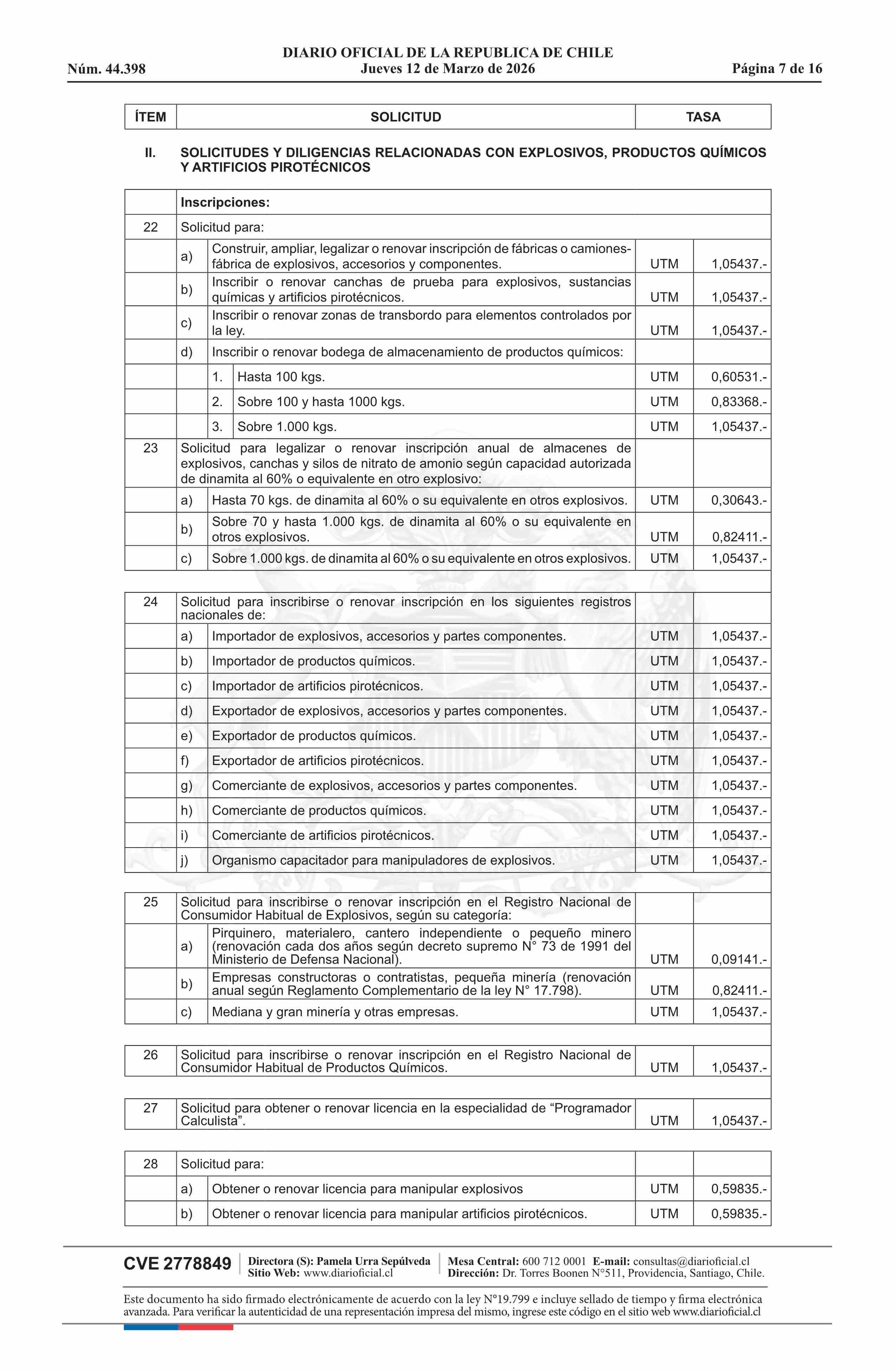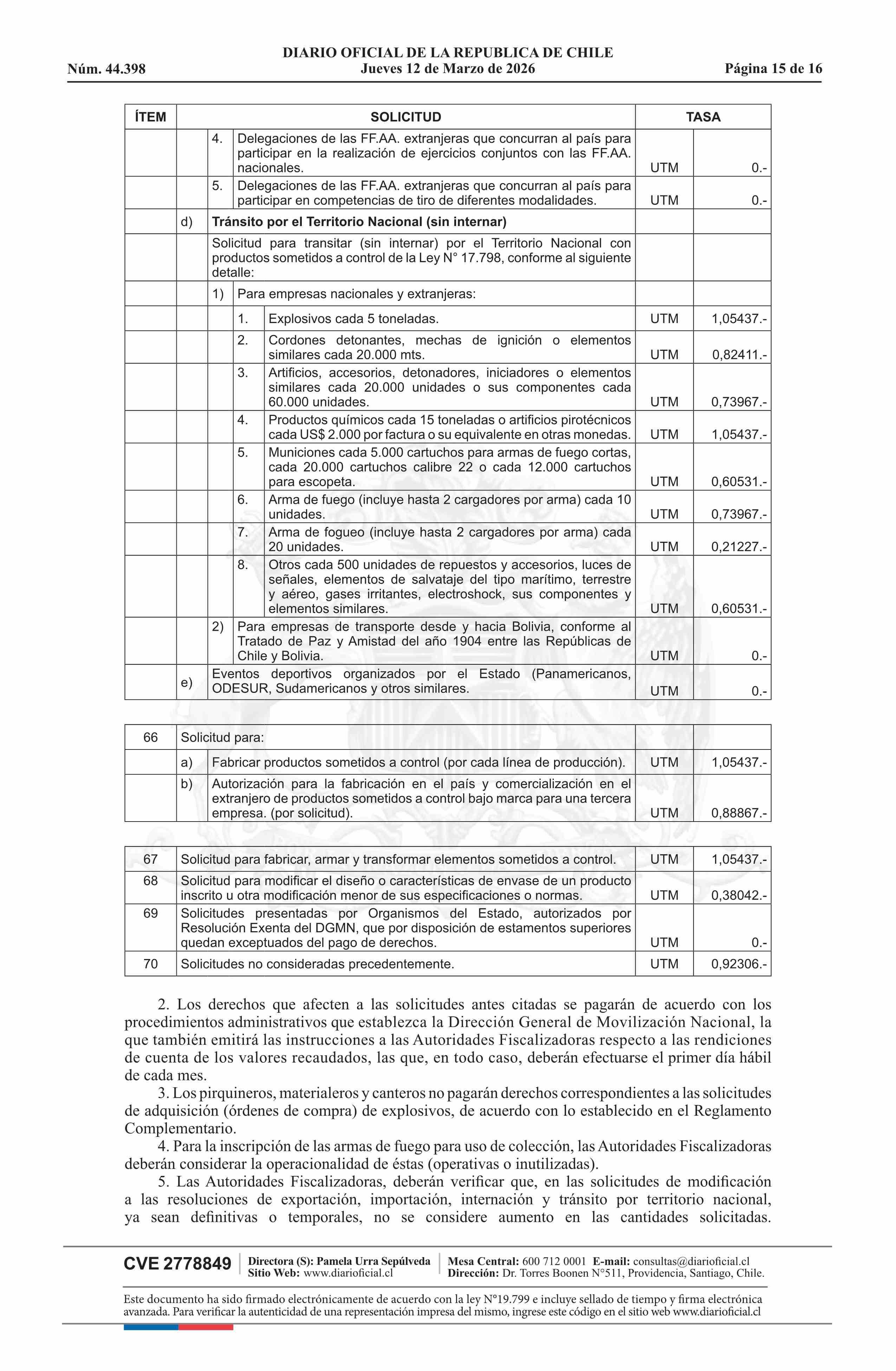 | Título: | Decreto exento número 1, de 2026.- Fija tasas de derechos a solicitudes de la ley N° 17.798, sobre Control de Armas |
