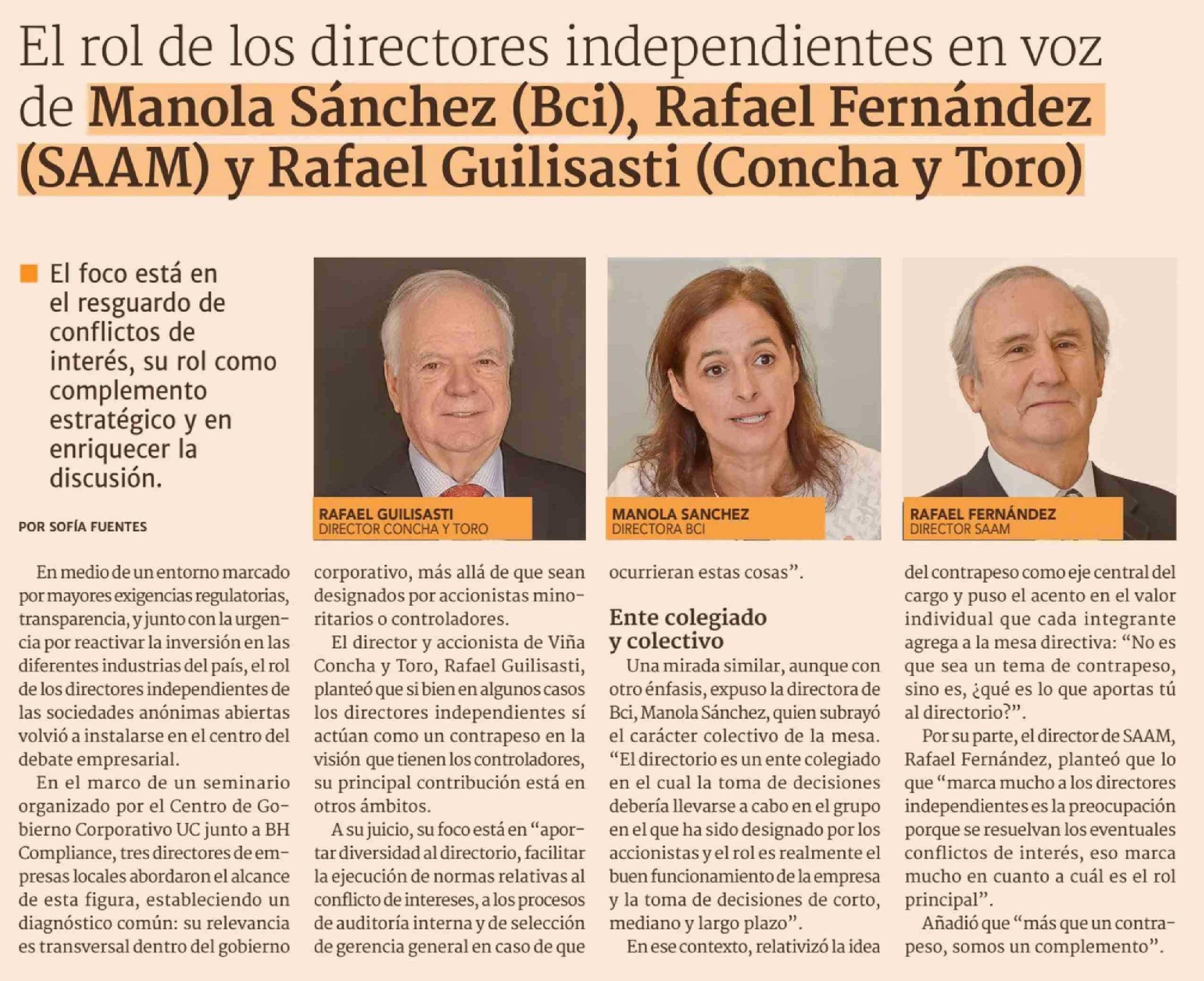El rol de los directores independientes en voz de Manola Sánchez (Bci), Rafael Fernández (SAAM) y Rafael Guilisasti (Concha y Toro)