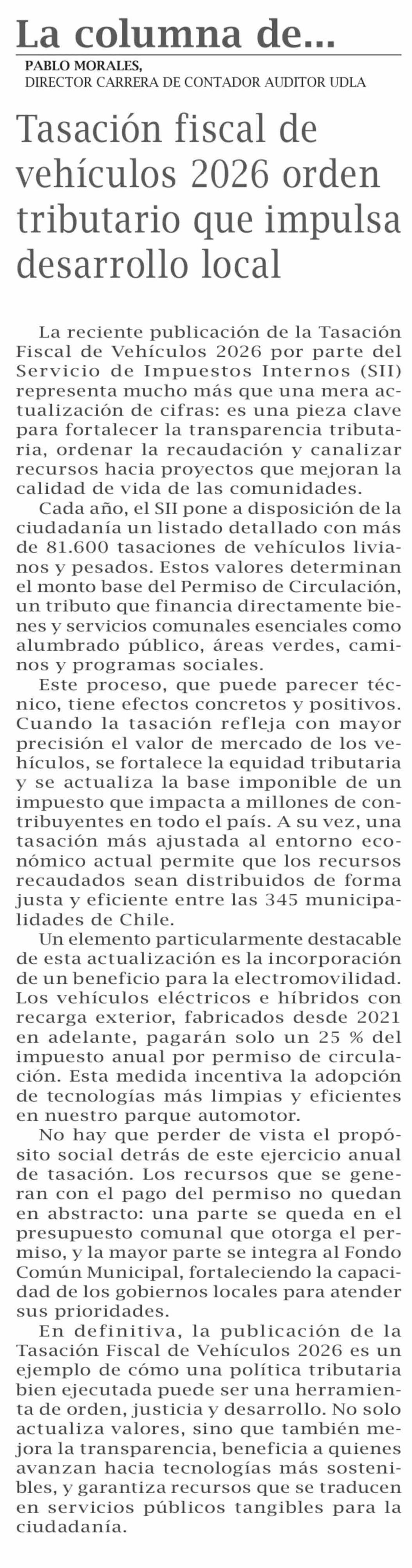 Columnas de Opinión: Tasación fiscal de vehículos 2026 orden tributario que impulsa desarrollo local