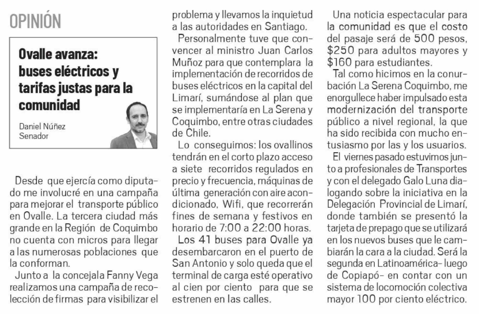 | Título: | Columnas de Opinión: Desde que ejercía como diputado me involucré en una campaña para mejorar el transporte público en Ovalle. La tercera ciudad más grande en la Región de Coquimbo no cuenta con micros para llegar a las numerosas poblaciones que la conforman. Junto a la concejala Fanny Vega realizam |