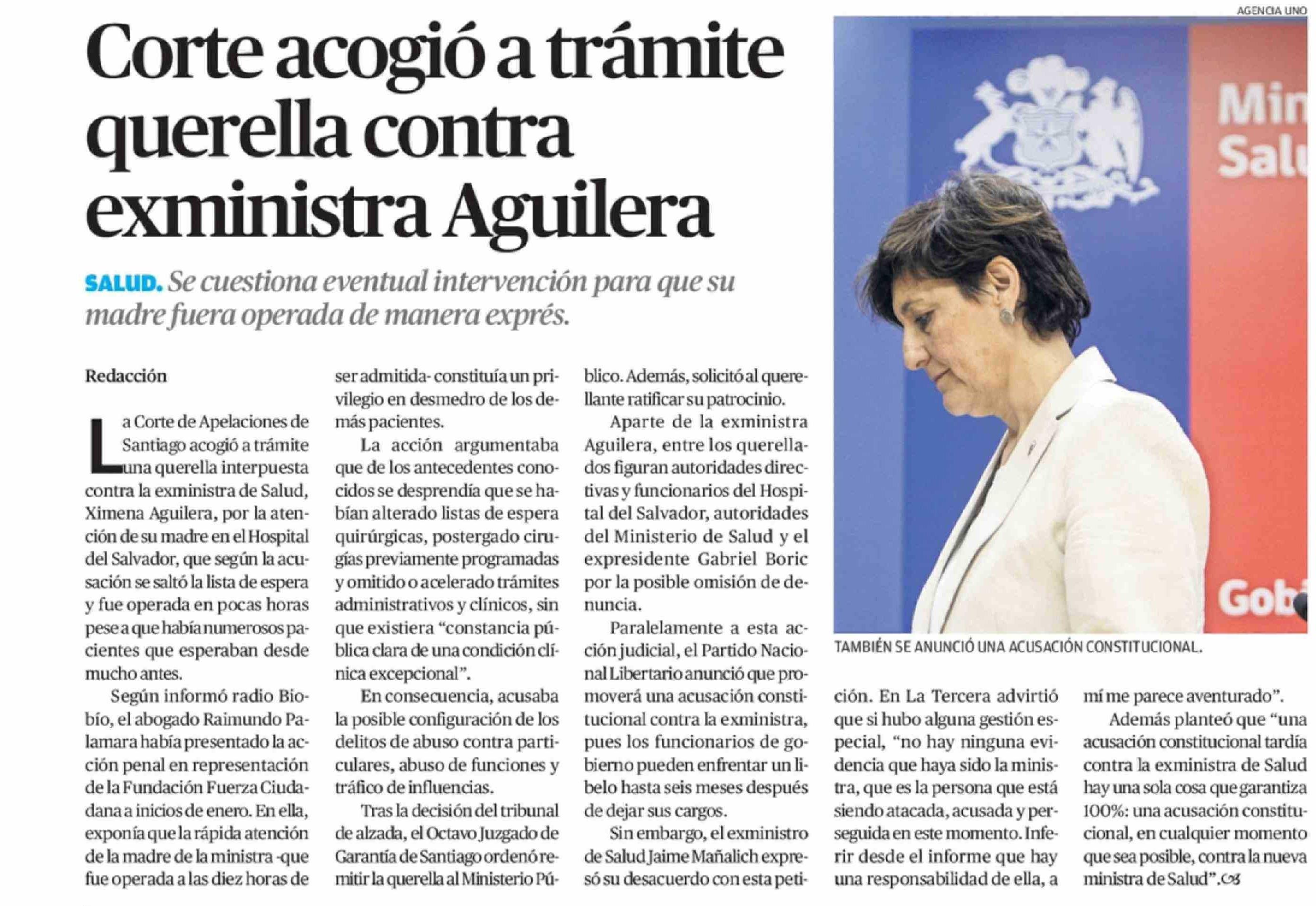 Título: Corte acogió a trámite querella contra exministra Aguilera