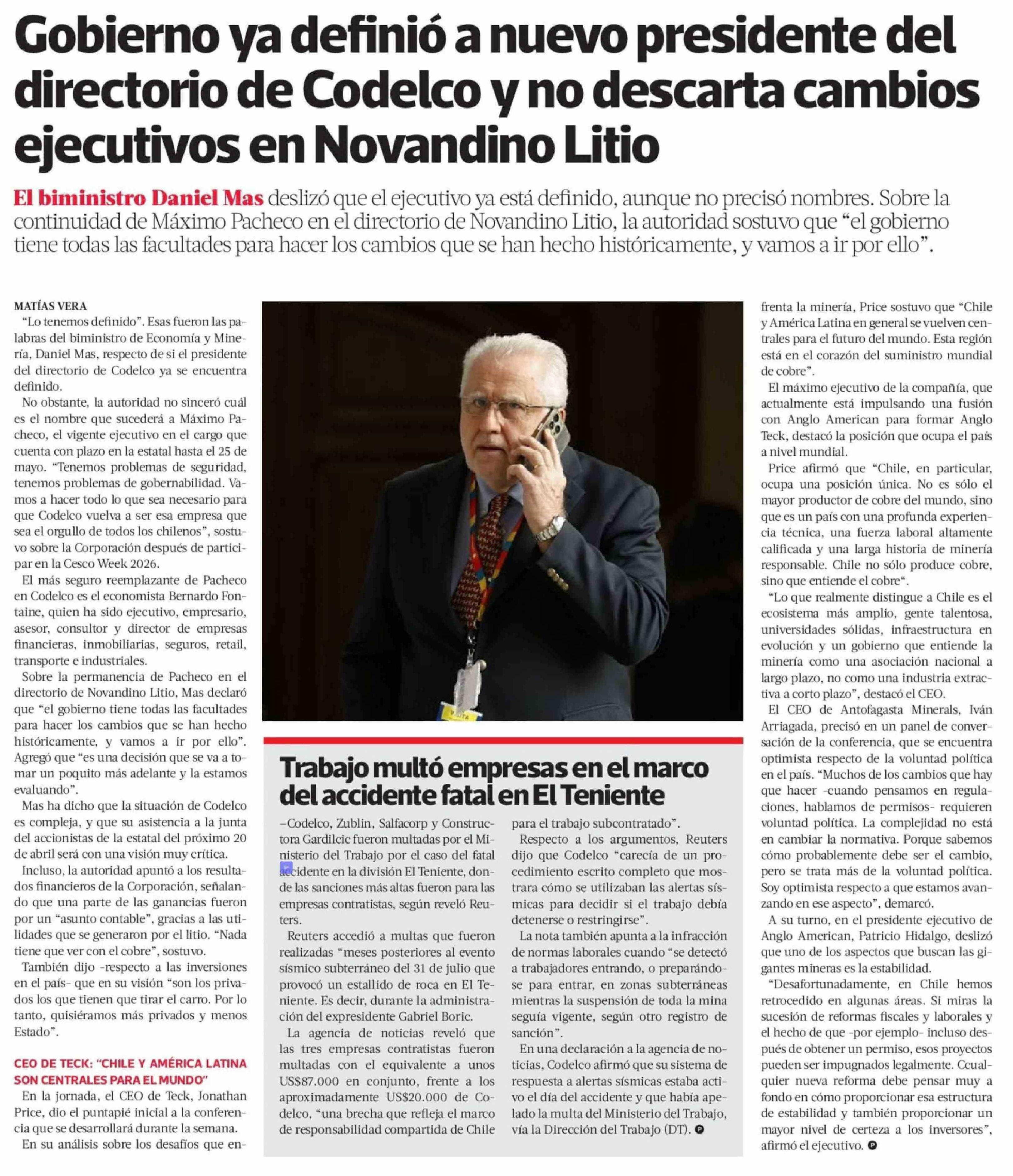 Gobierno ya definió a nuevo presidente del directorio de Codelco y no descarta cambios ejecutivos en Novandino Litio