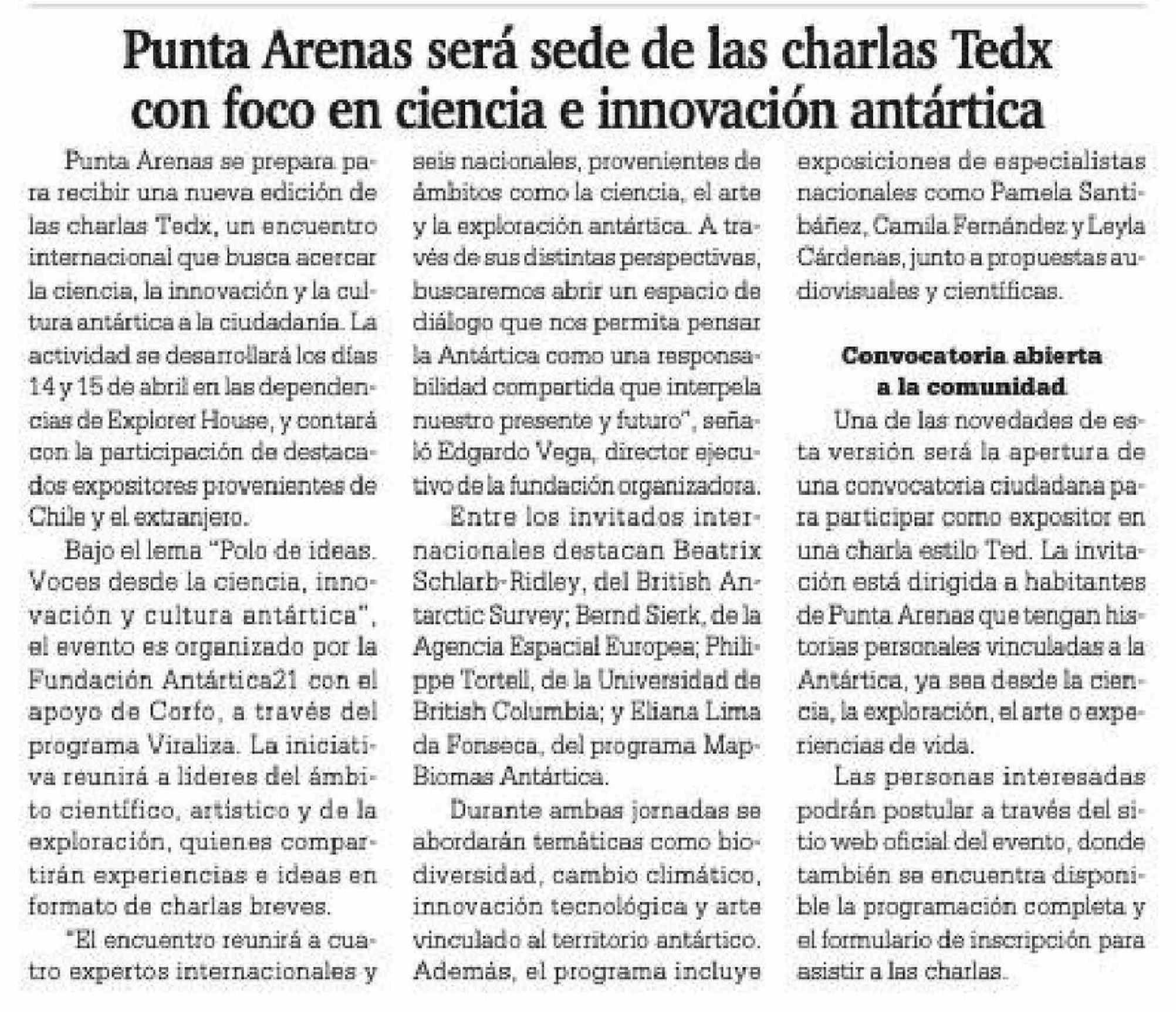 Título: Punta Arenas será sede de las charlas Tedx con foco en ciencia e innovación antártica